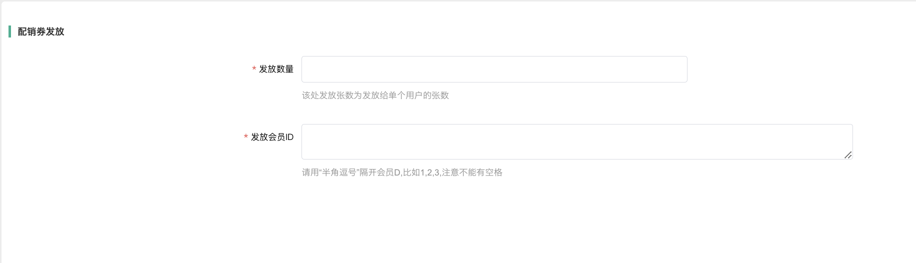 后台手动发放券,需输入发放的数量,注意,该处发放张数为发放给单个用户的张数,比如要给会员A和会员B各自获得5张,这里发放数量填写5。