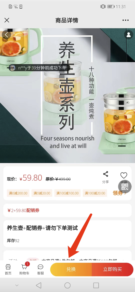 (四)点击商品进入商品详情页,底部会显示兑换按钮(配销券当月没有使用次数时则不显示兑换按钮)