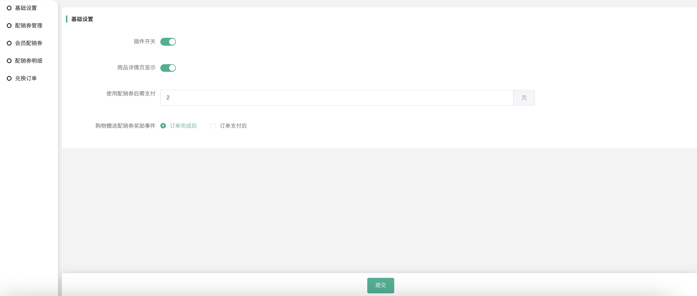 3、设置购物赠送配销券的奖励事件:订单完成后,是订单要确认收货。订单支付后,是要订单付款成功之后。设置好后,要进入商品设置里开启购物赠送配销券,如下图。