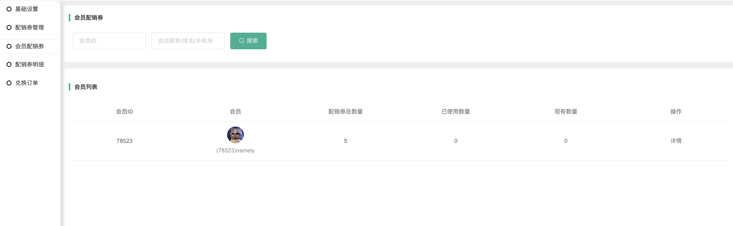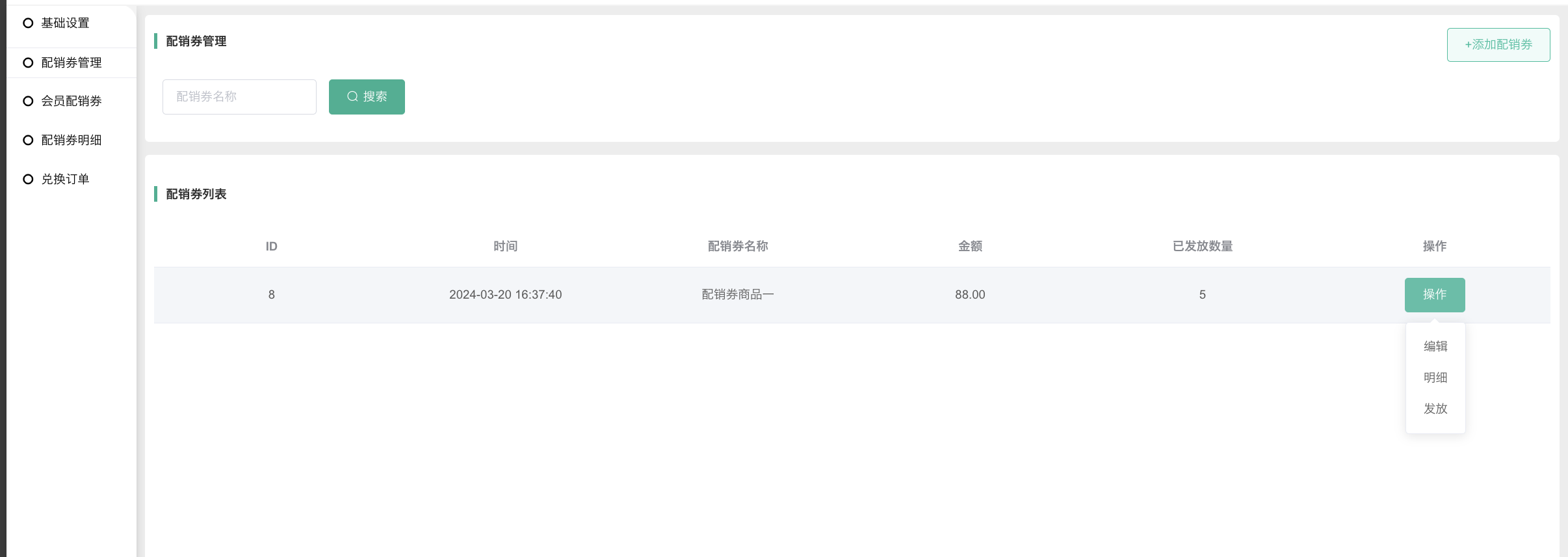 显示所有配销券,在当前列表可查看到已发放数量,点击操作–明细跳转到配销券明细页面,可以二次编辑,支持后台手动发放。