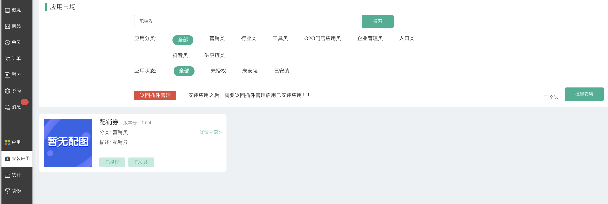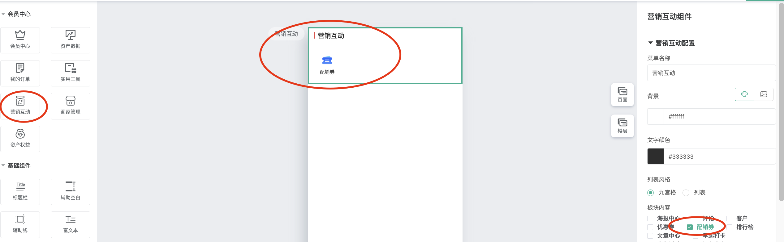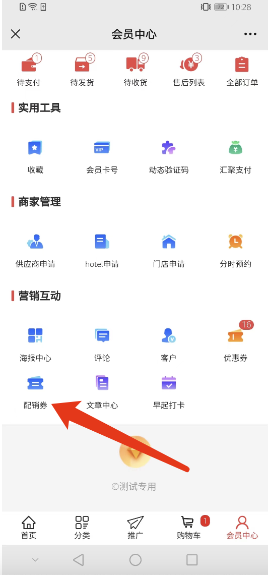 (一)会员中心–营销互动–显示“配销券”入口。系统页面会自带,也可后台通过装修会员中心勾选显示。