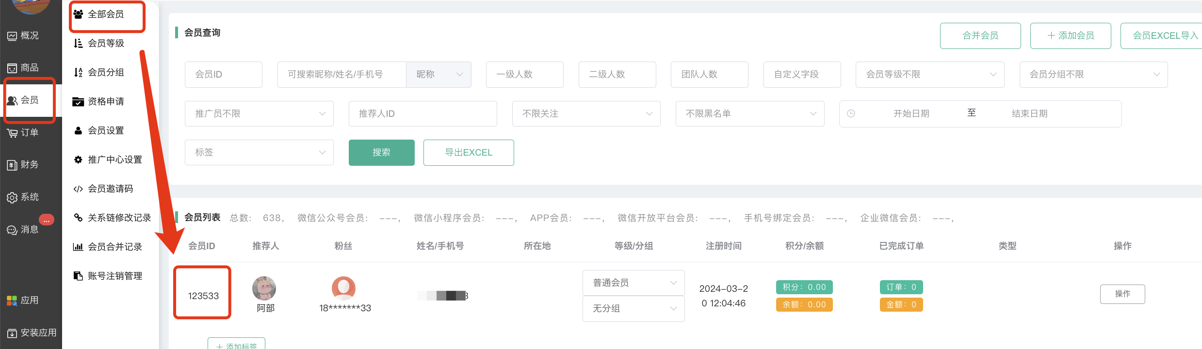 发放会员ID是填写会员的ID,可在后台会员列表那查看(如下图查看路径)。如果要发放给多个会员,请用“半角逗号”隔开,比如1,2,3, 注意不能有空格。