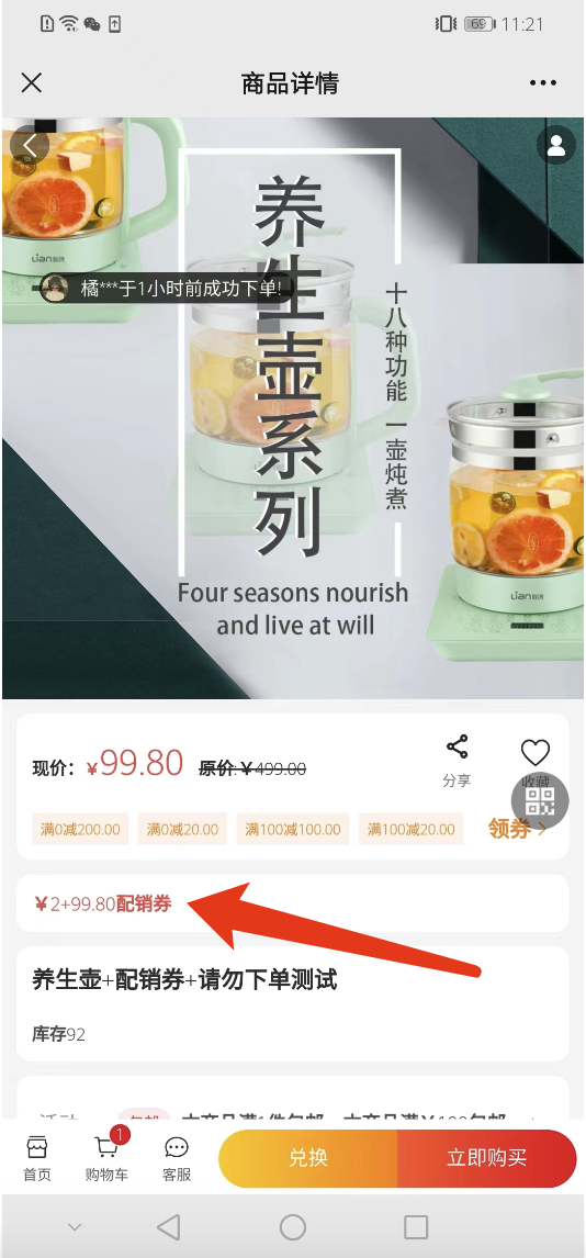 2、可选择商品详情是否显示配销券,前端显示效果如下