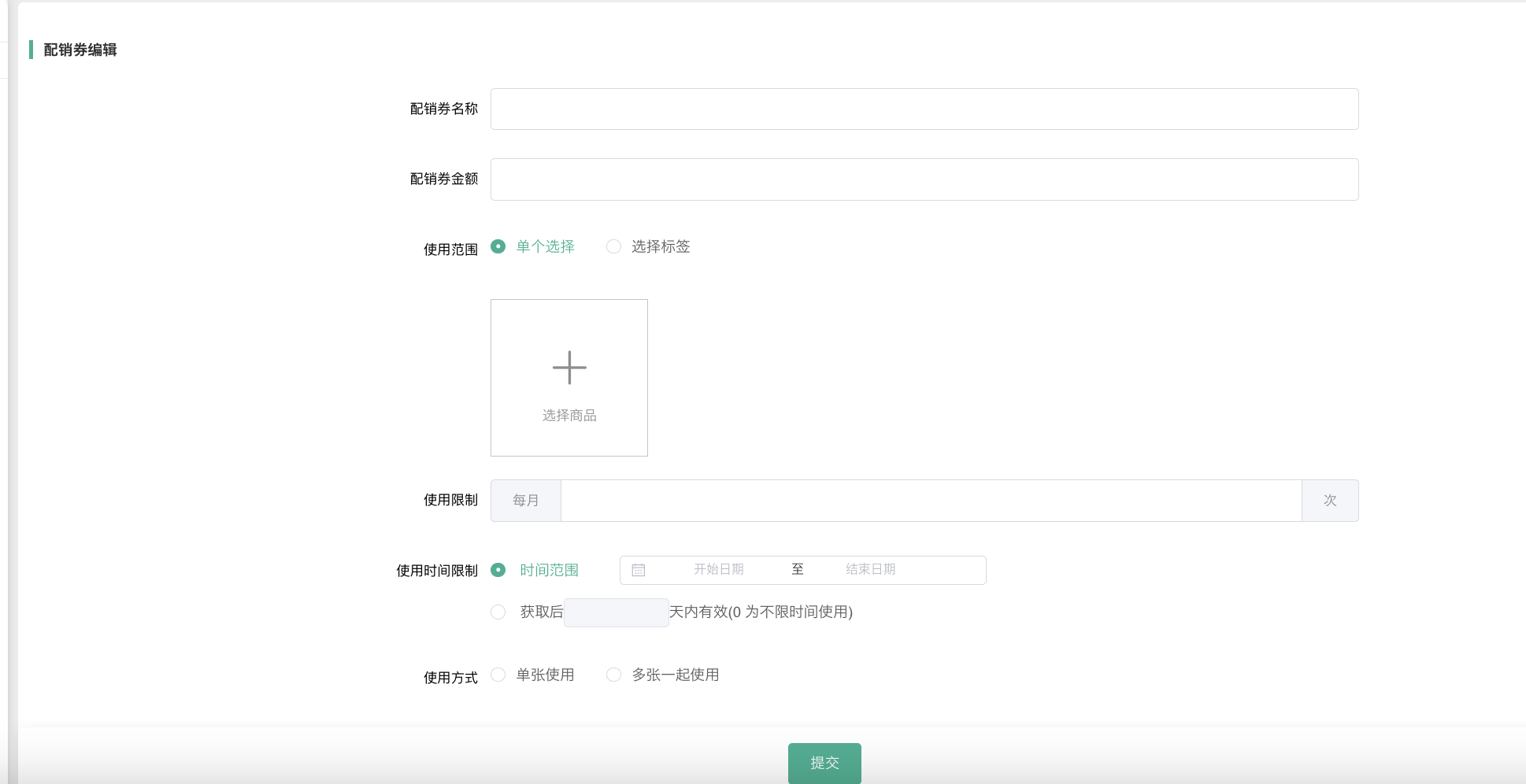 商品编辑–营销设置增加配销券挂件(平台自营、供应商、聚合供应链商品),可设置购物赠送配销券的开关,开启之后,会员下单,系统会根据奖励事件来发放配销券。