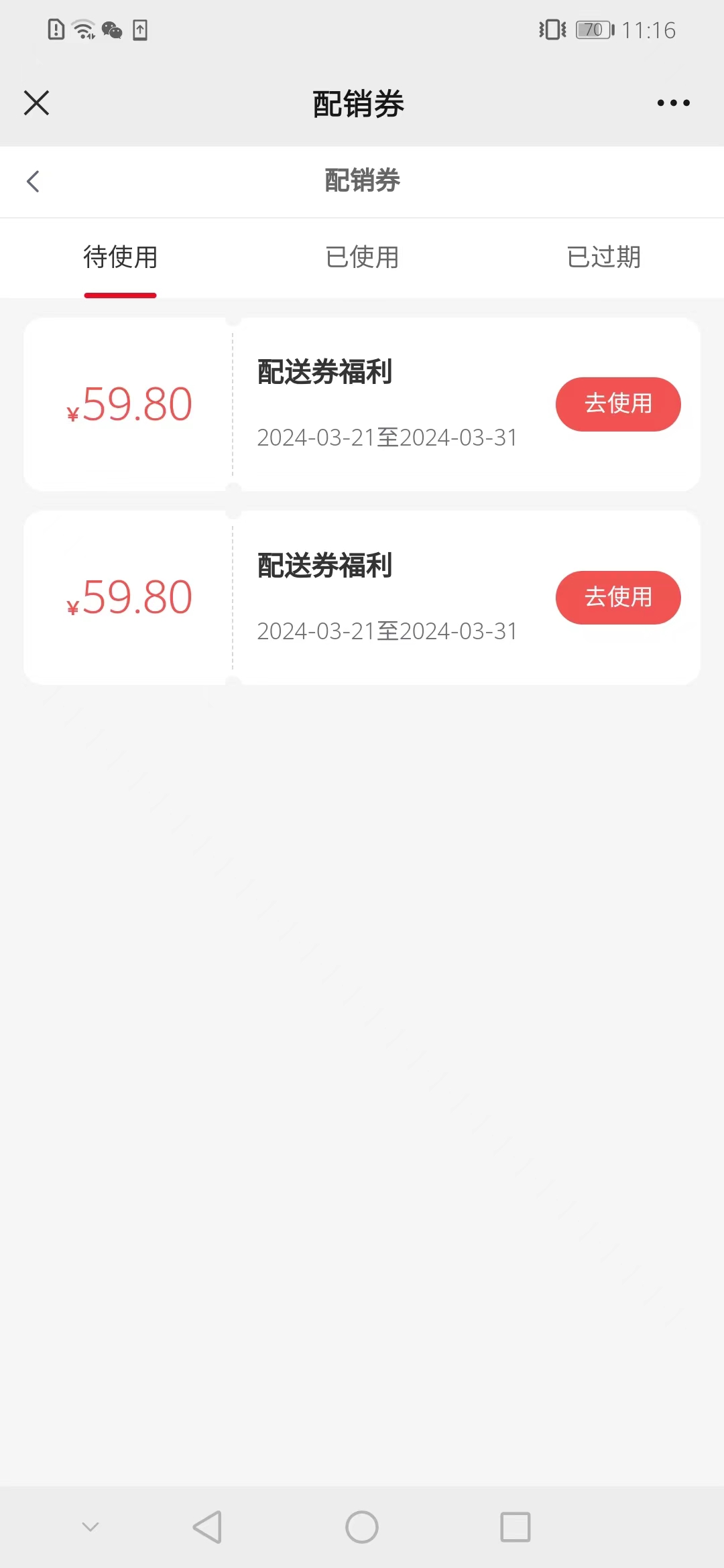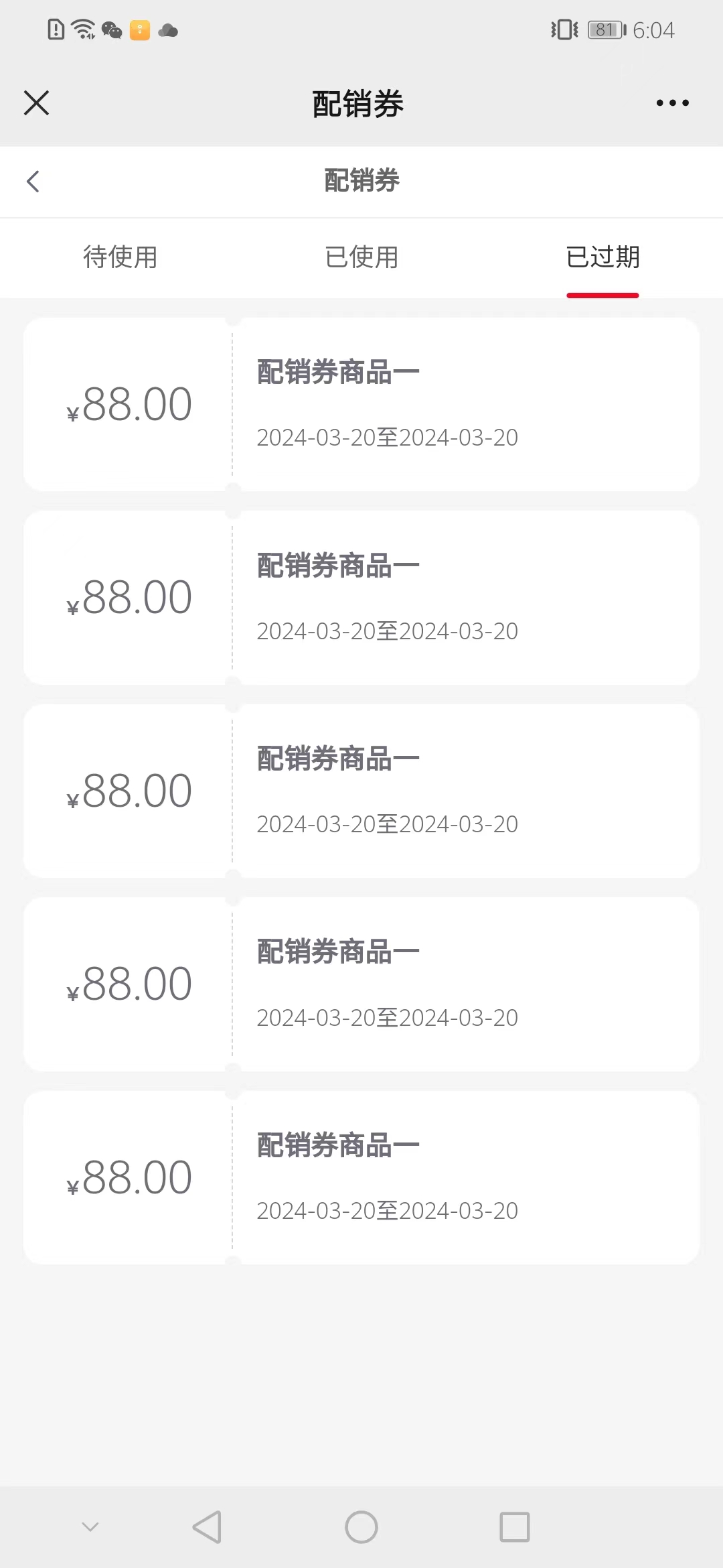 (二)进入显示所有配销券,当前列表的配销券每小时定时执行一次验证配销券是否过期,会员购买商品赠送了已过使用有效期的配销券,也需要过大概一个小时才会变为已过期。不影响下单,下单选择配销券时不能选择不在有效期范围内的配销券