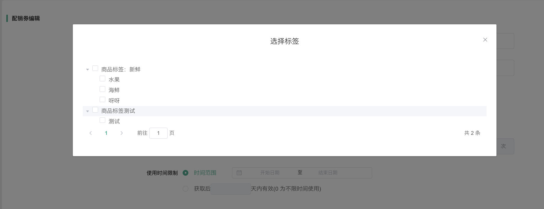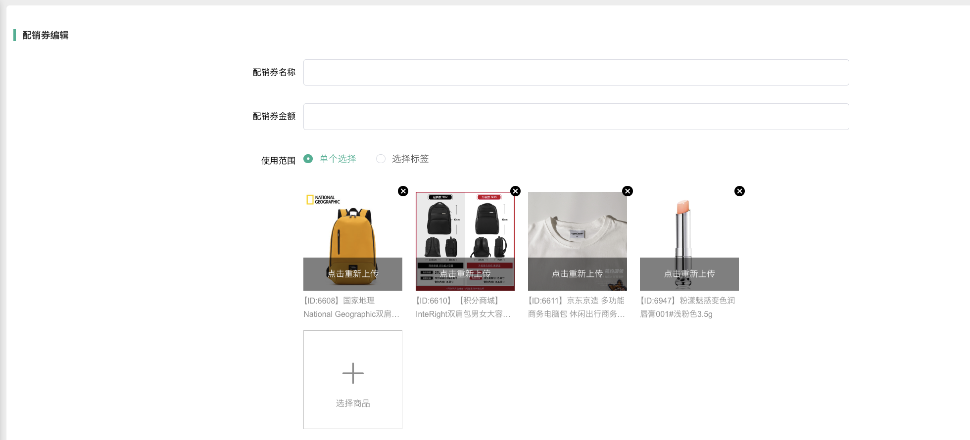 2、使用范围,可单个选择商品或按照商品标签选择,可添加多件商品,但仅支持平台自营、供应商、聚合供应链商品