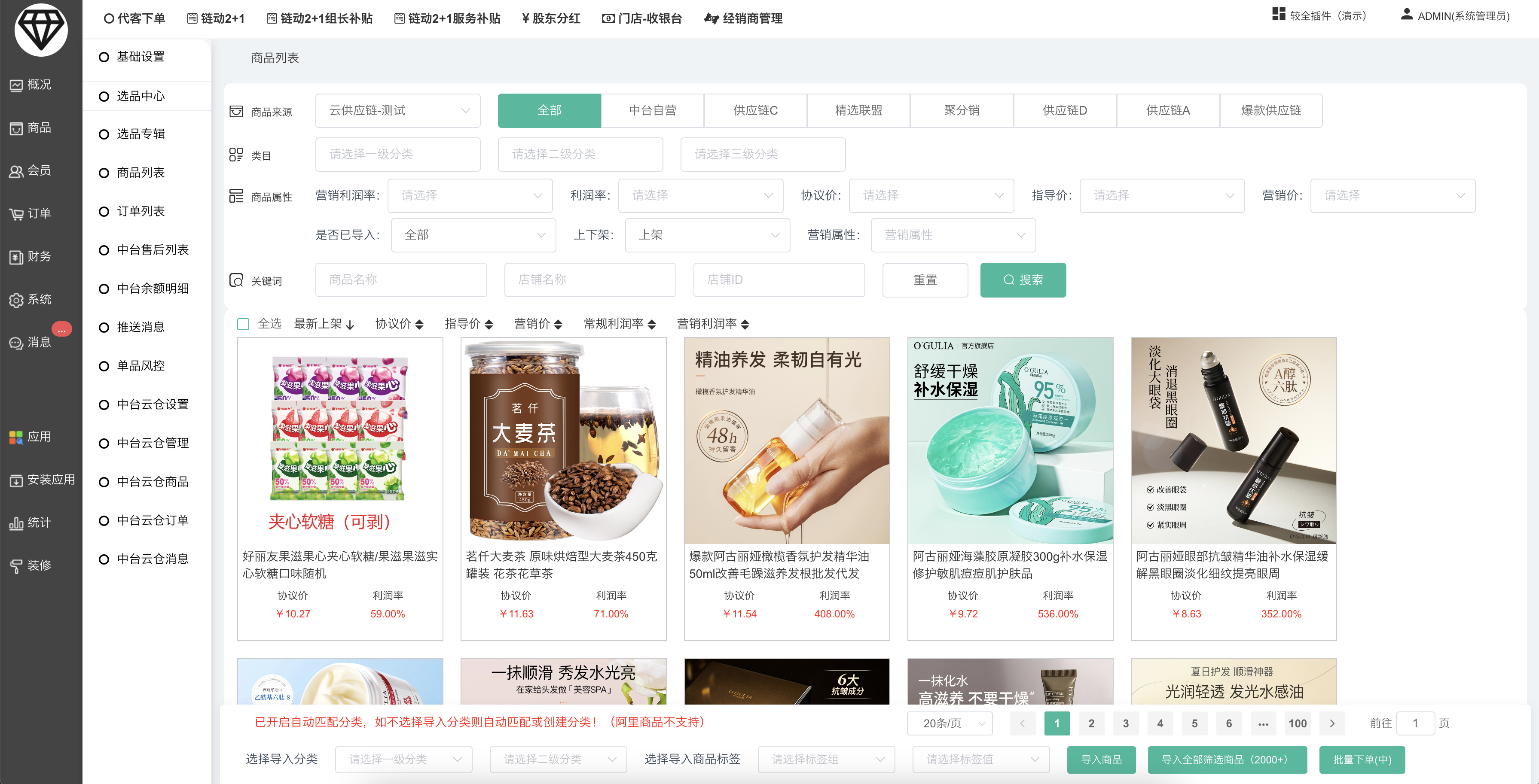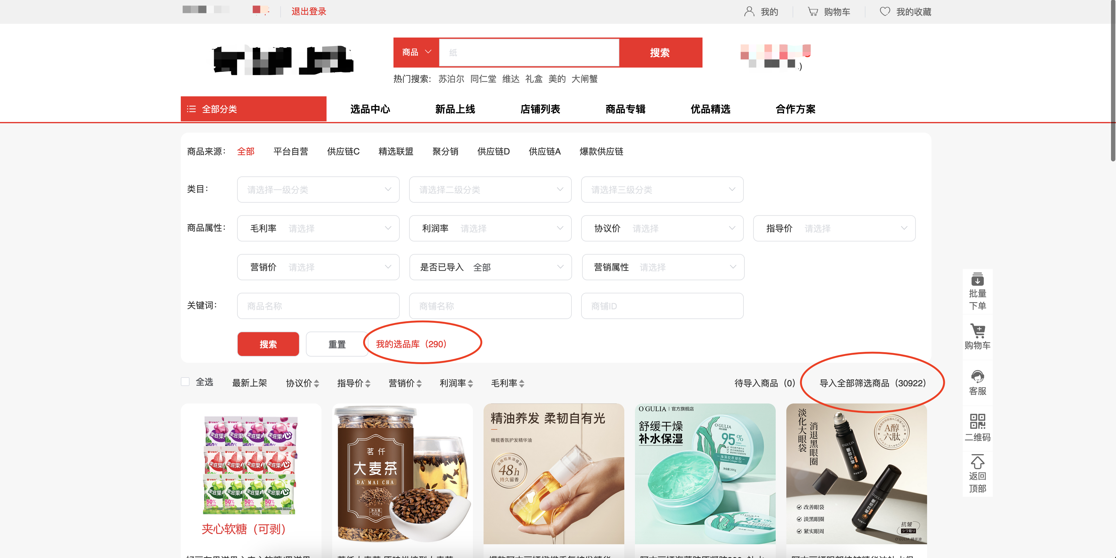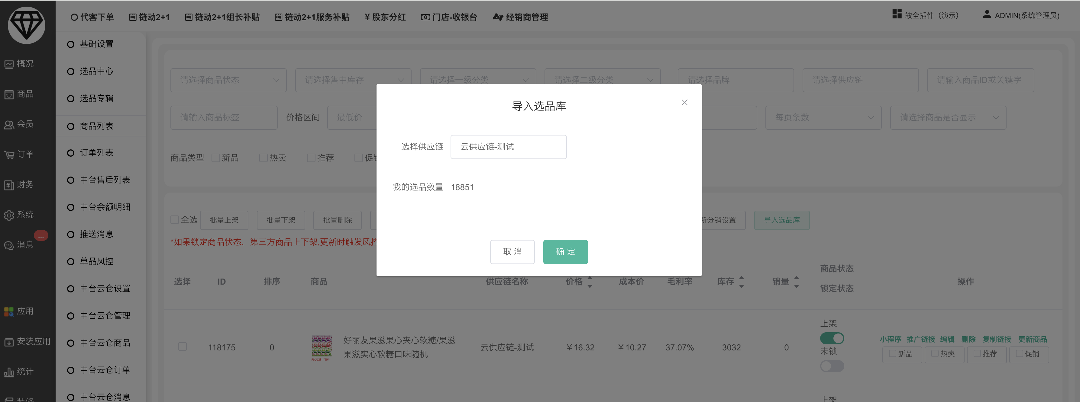 1、通过供应链中台选品库页面,将商品加入选品库;