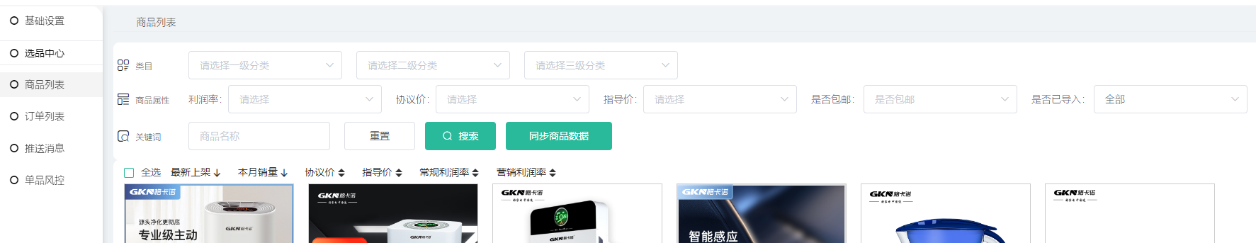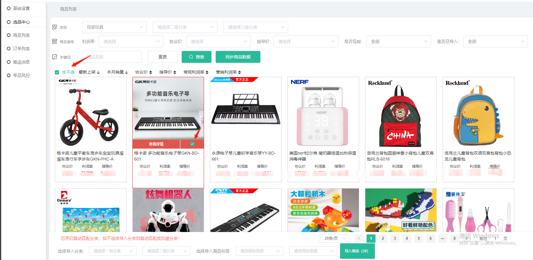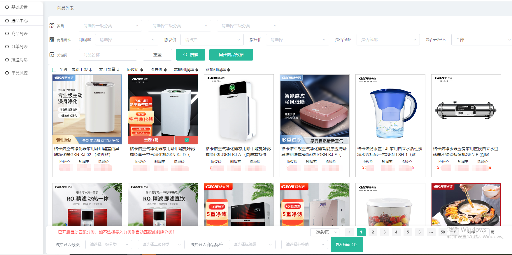 二、选品中心作者: aishidai / 2025年11月21日 先点击同步商品数据进行商品数据同步,再筛选导入 1、商城可以进行选品–导入商城,进行售卖。 2、可以按商品类目/商品属性/关键词等,筛选搜索可导入的商品 3、全选当页/单个选择商品,导入到商城 4、导入前,选择要导入的分类和标签