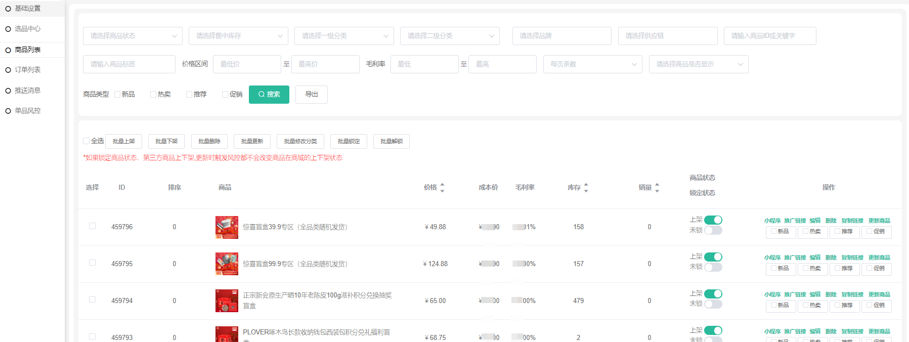 3、可对商品操作批量上架、批量下架、批量删除,批量更新,批量修改分类,批量锁定,批量解锁(如修改了商品定价等,可以更新商品,使商品同步定价策略来定价),批量修改分类,批量锁定,批量解锁;