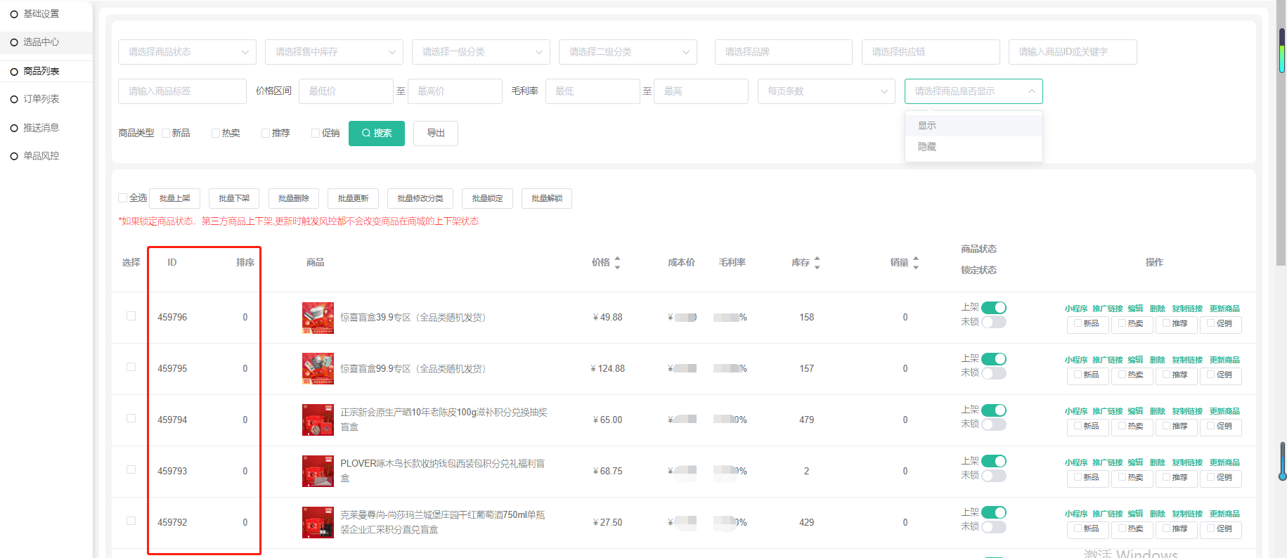 2、商品按导入先后顺序显示,商品ID是同步商城商品进行显示的(如商城现在最新发布商品的ID为100,下一个导入的供应链商品ID为101),可手动设置调整商品排序