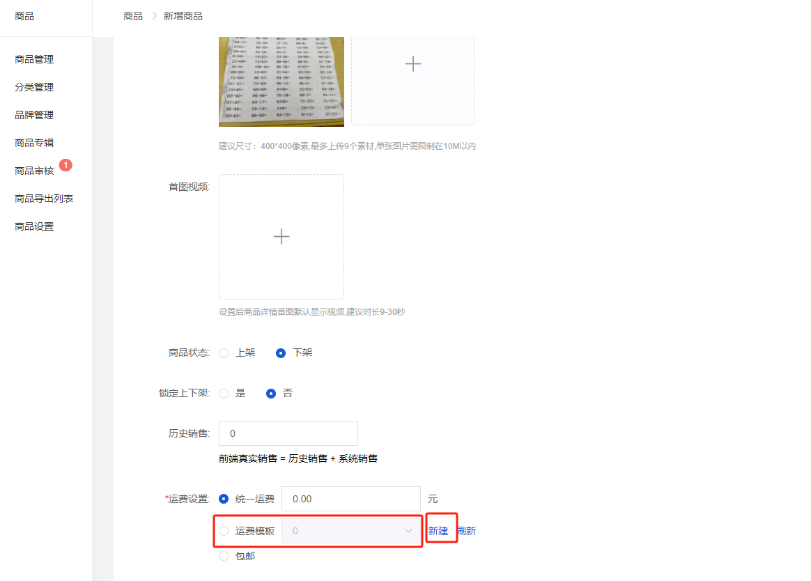 后台商品支持选择运费模板,也可以创建新的运费模板之后再进行选择。如下图所示。