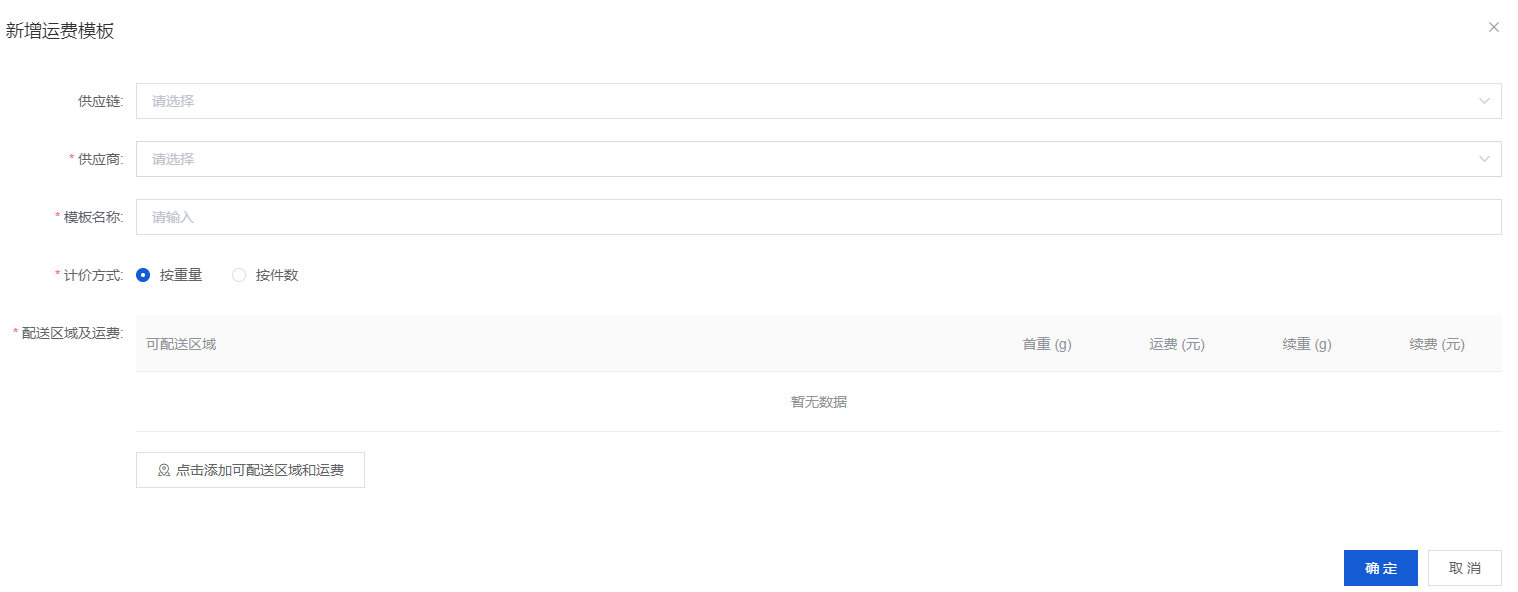 添加配送方式:支持设置多种不同配送模板,支持按重量计费或者按件计费设置配送模板,配送模板支持设置不同区域不同费用