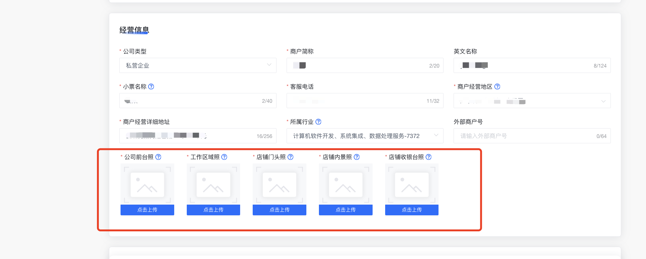 经营场景选择【线上平台】或【同时选择线下线上两个场景】,则需提供《公司前台照》、《工作区域照》、《店铺门头照》、《店铺内景照》、《店铺收银台照》