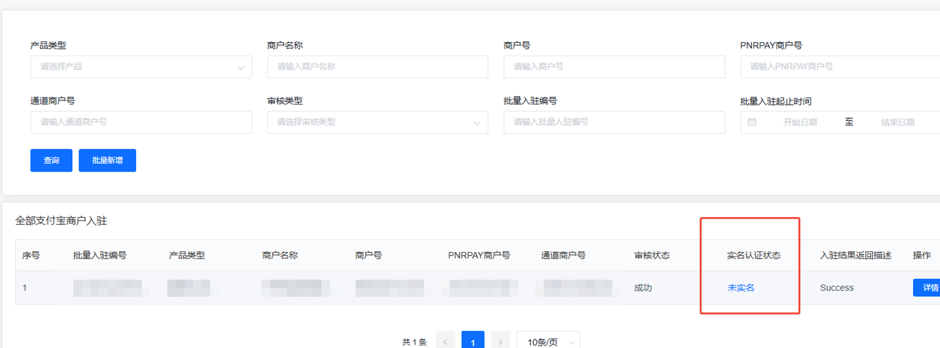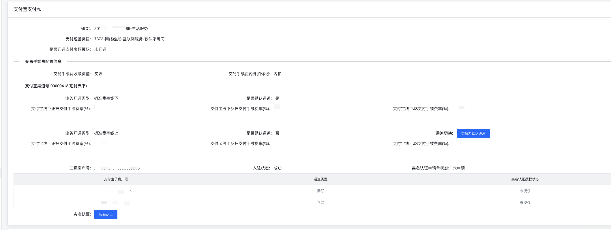 2、若实名认证状态为未实名,点击未实名,显示新的支付宝渠道号,新的支付宝渠道号切换为默认通道,实名认证授权状态会从已实名变为未实名,重新扫二维码实名授权,状态就会再次变更为已实名