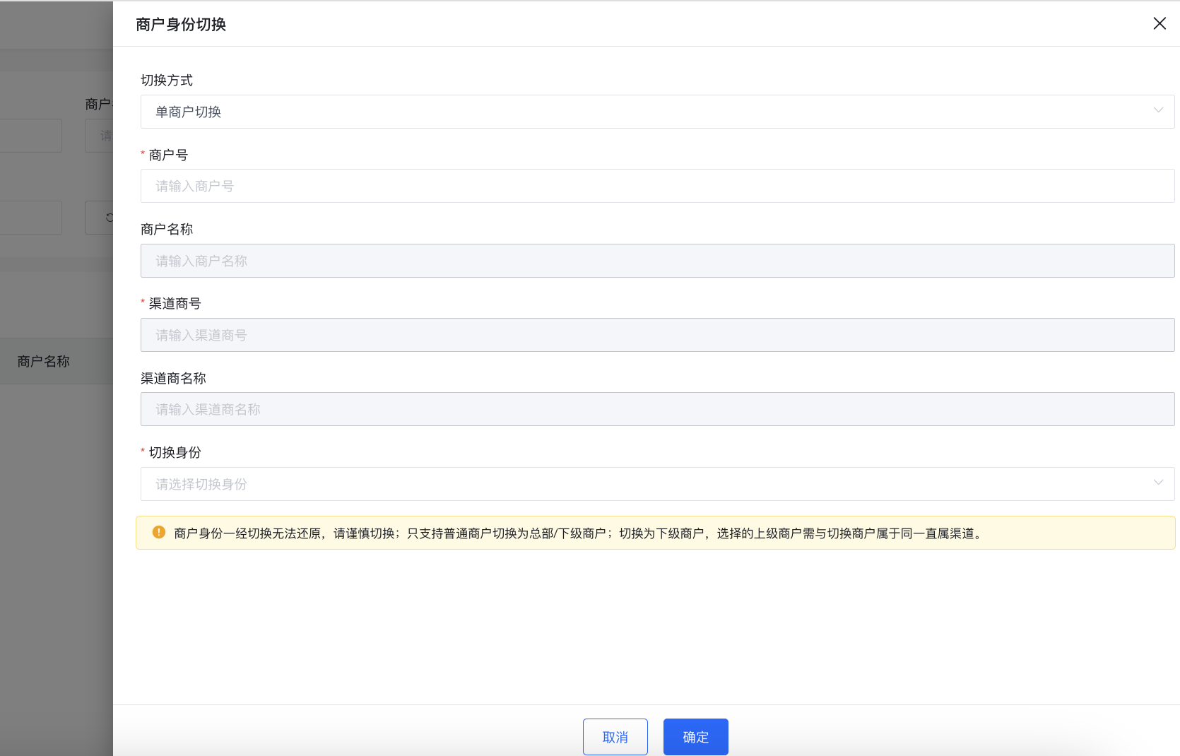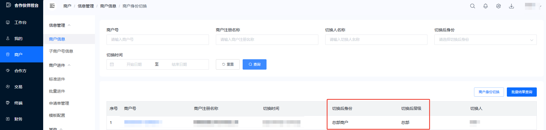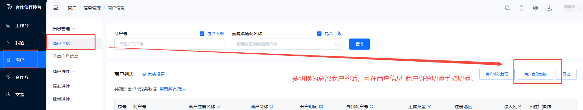 若需要分账功能,一开始入驻商户时选择的是普通商户,没及时切换为总部商户,可在商户身份切换列表手动切换,商户身份一经切换无法还原,请谨慎切换;只支持普通商户切换为总部/下级商户;切换为下级商户,选择的上级商户需与切换商户属于同一直属渠道。如下图所示