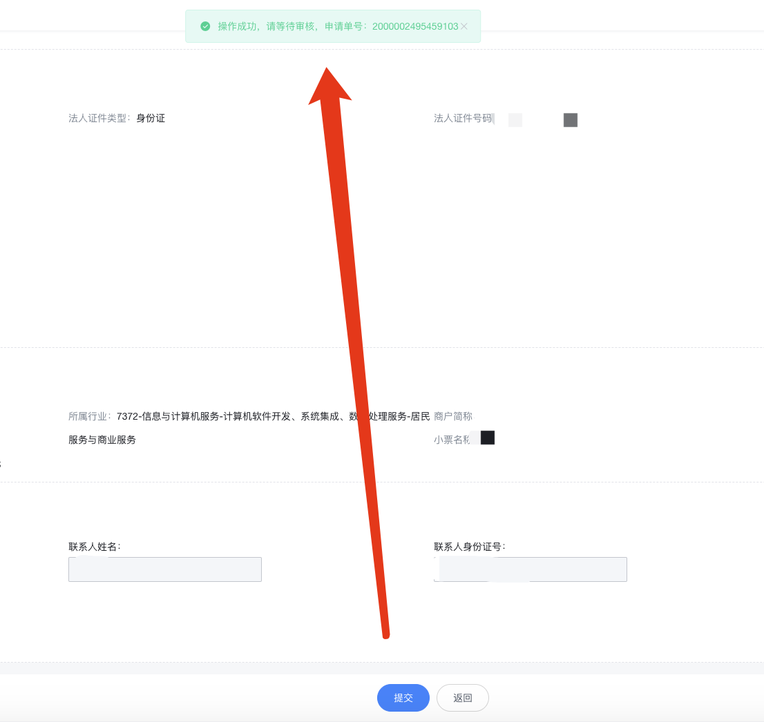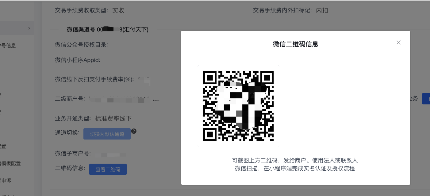 提交实名认证申请,返回认证界面,有个查看二维码信息的按钮,点击获取二维码,可以截图发给商户(法人或联系人)进行扫码确认,完成实名认证及授权流程。