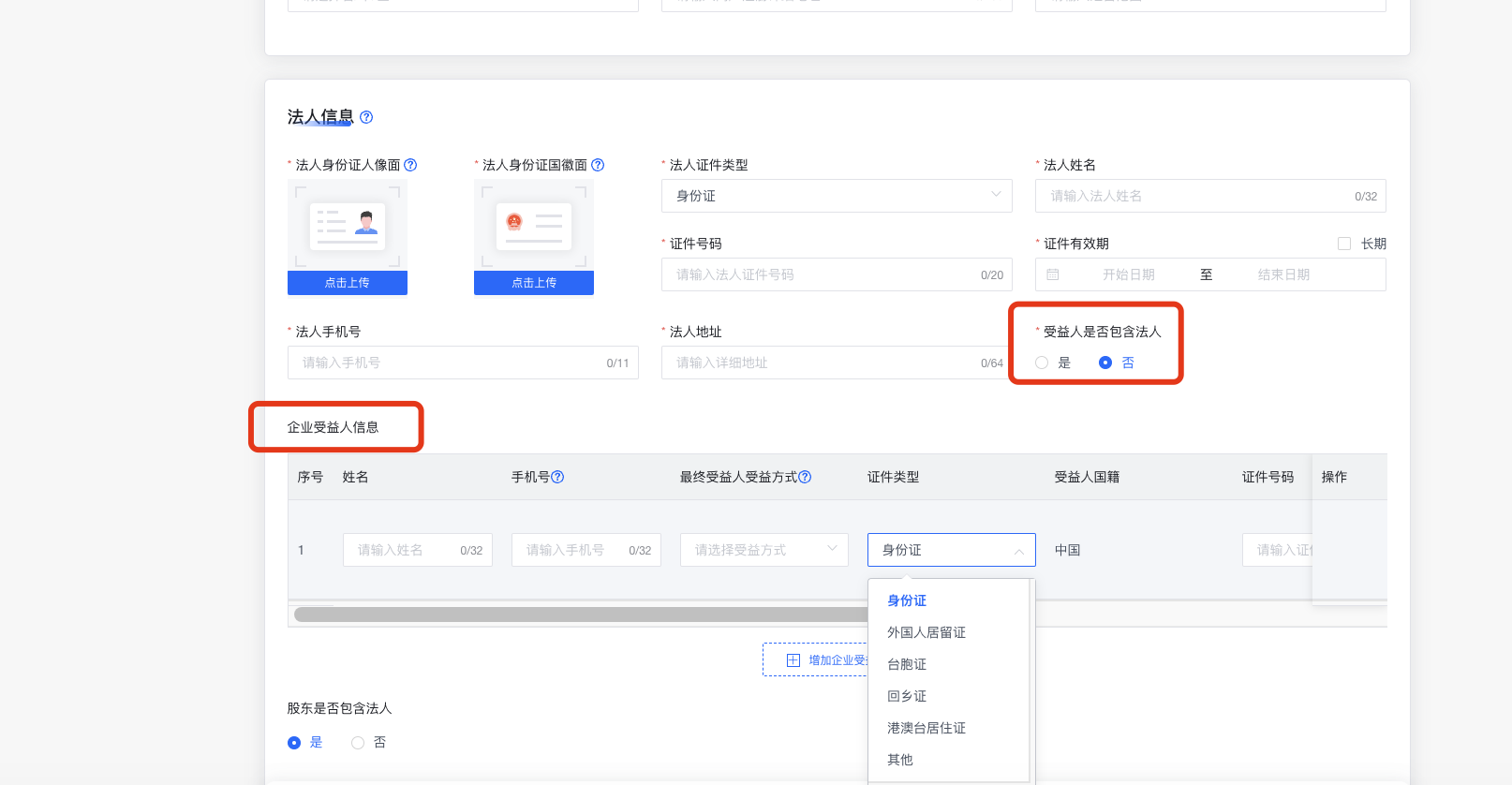 4、填写法人信息:法人证件类型(身份证、护照、港澳台通行证、其他)、法人姓名、证件号码、证件有效期、法人手机号、法人地址、法人是否为受益人。
