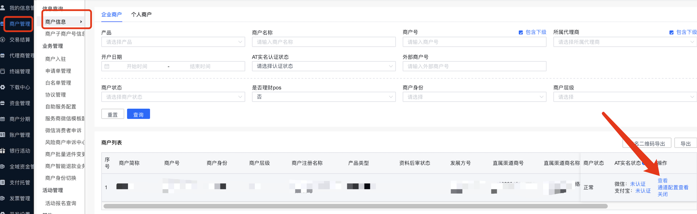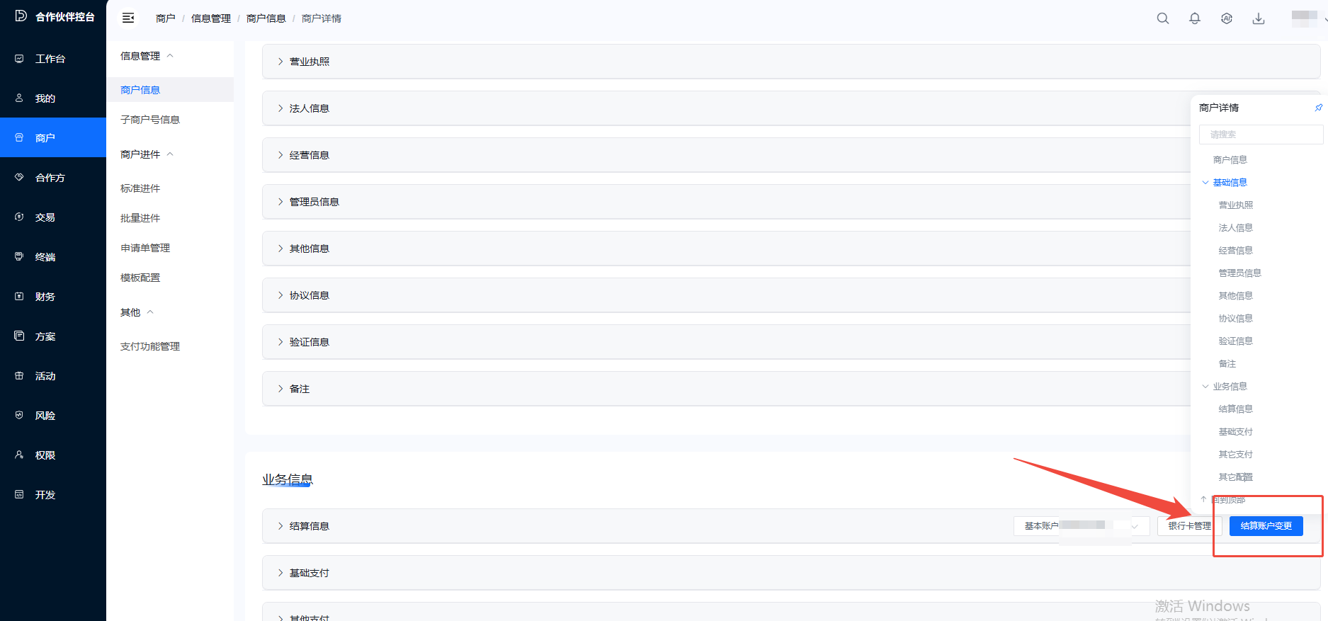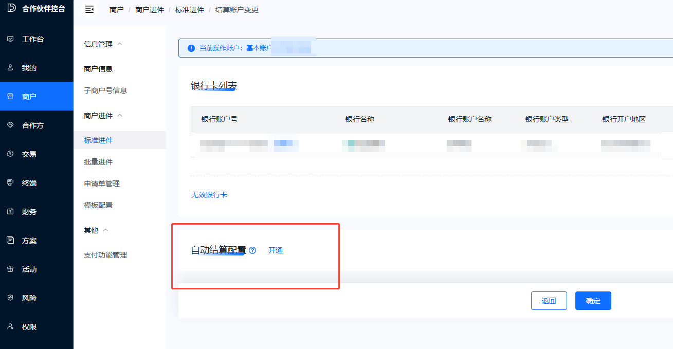 补开自动结算路径:商户管理 — 商户信息 — 查看 — 业务信息 — 结算账户管理