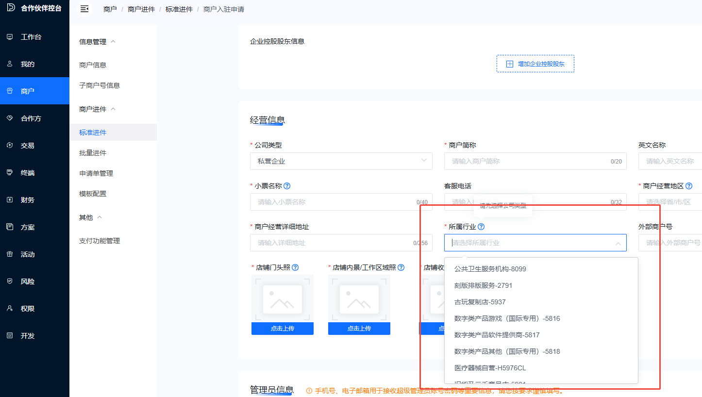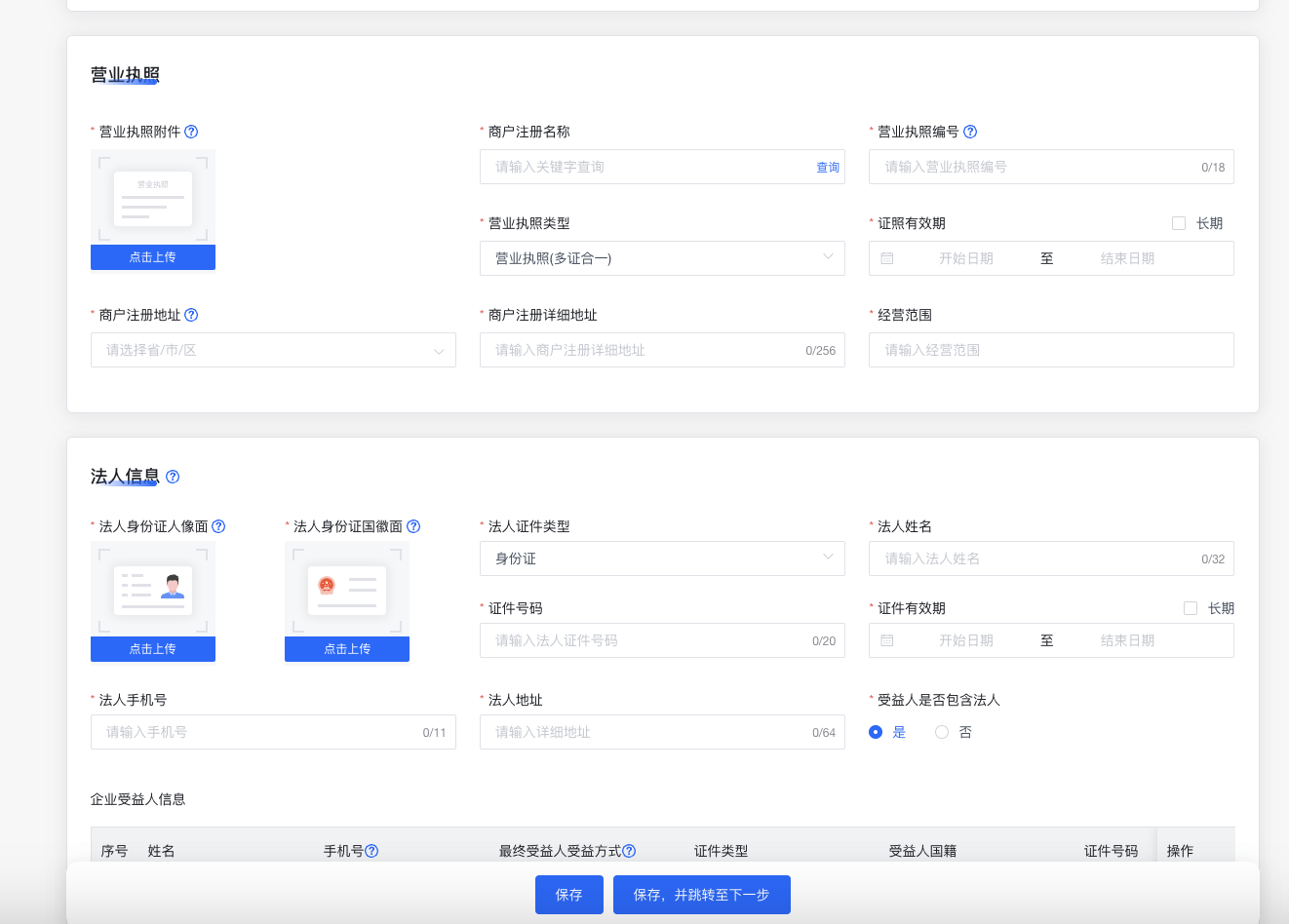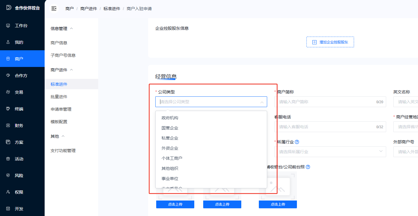 注意:公司类型 和 所属行业,根据公司类型如实选择,一旦选择保存了不可修改,只能重新进件。营业执照主体是公司名,非政府单位机构的,可选“私营企业”。