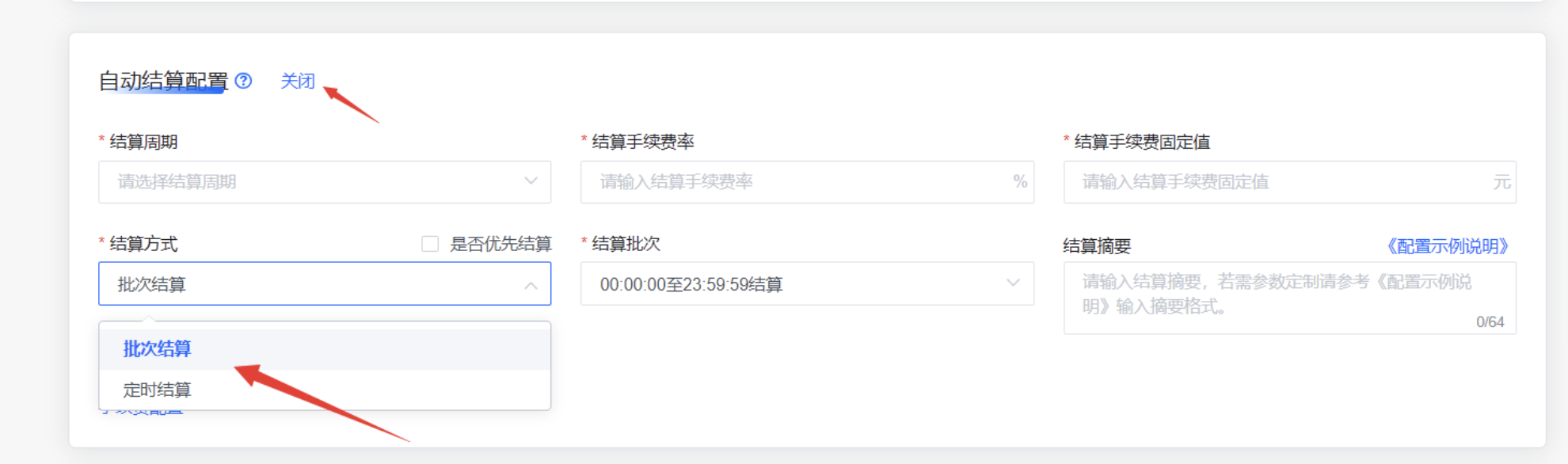 2、配置自动结算:默认开通,支持关闭,结算周期(D1、T1)、结算手续费率、结算手续费固定值、结算方式(批次结算、定时结算)、结算批次、结算摘要、手续费配置。