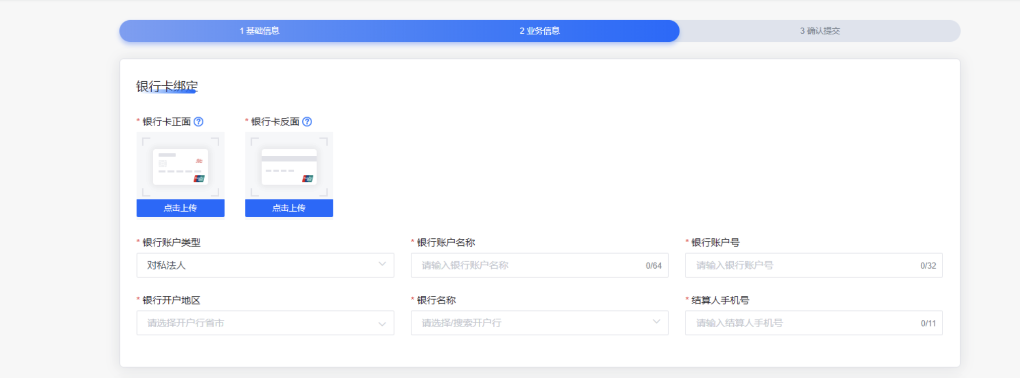 (2)银行账户类型选择对私法人:银行账户名称、银行账户号、银行开户地区、银行名称、结算人手机号