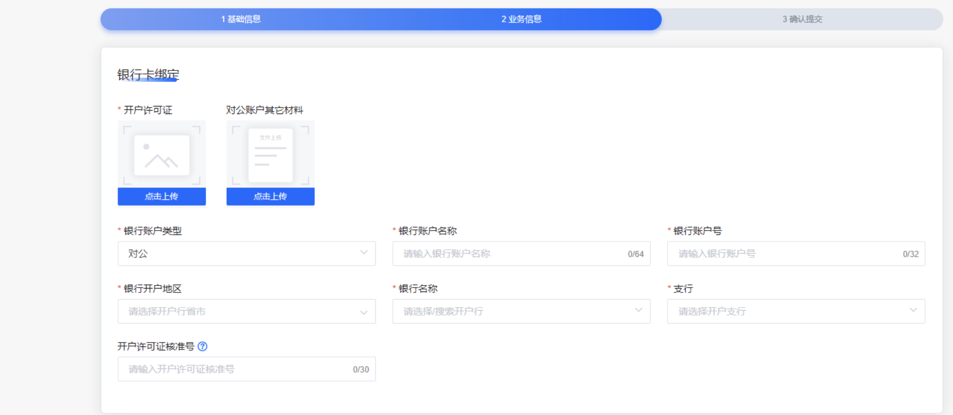 (1)银行账户类型选择对公:银行账户名称、银行账户号、银行开户地区、银行名称、支行、开户许可证核准号。