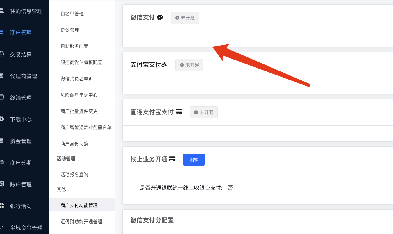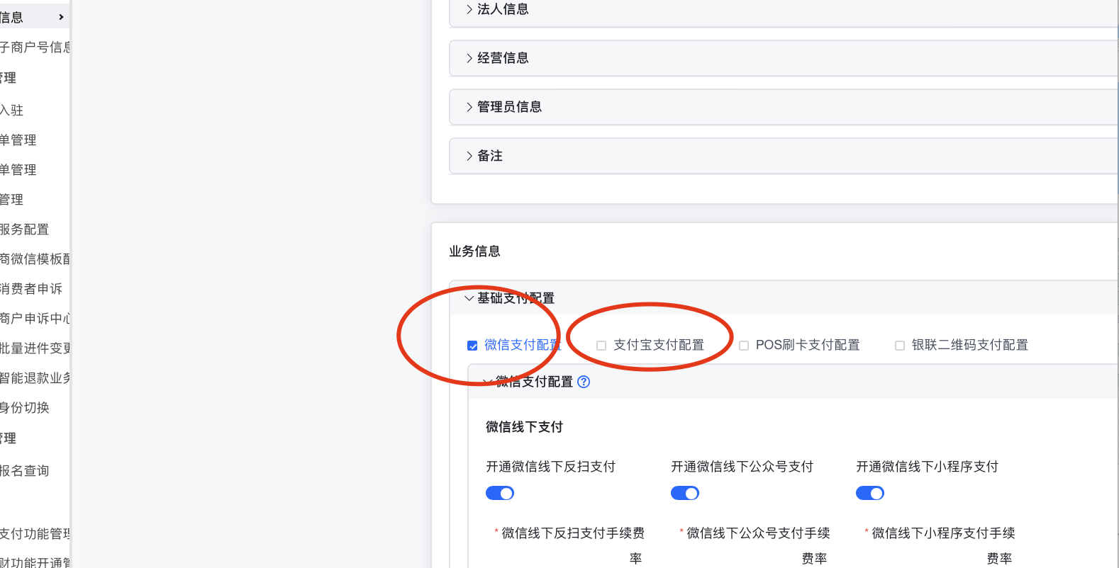 (一)进件商户时,基础支付有勾选微信支付、支付宝支付等,入驻之后,为什么认证界面显示未开通呢,如下图。