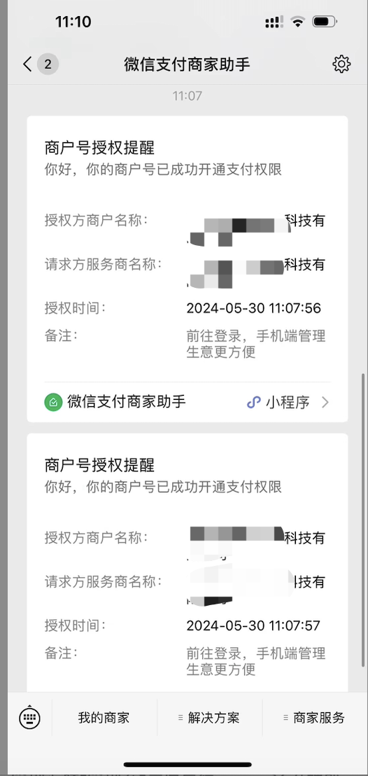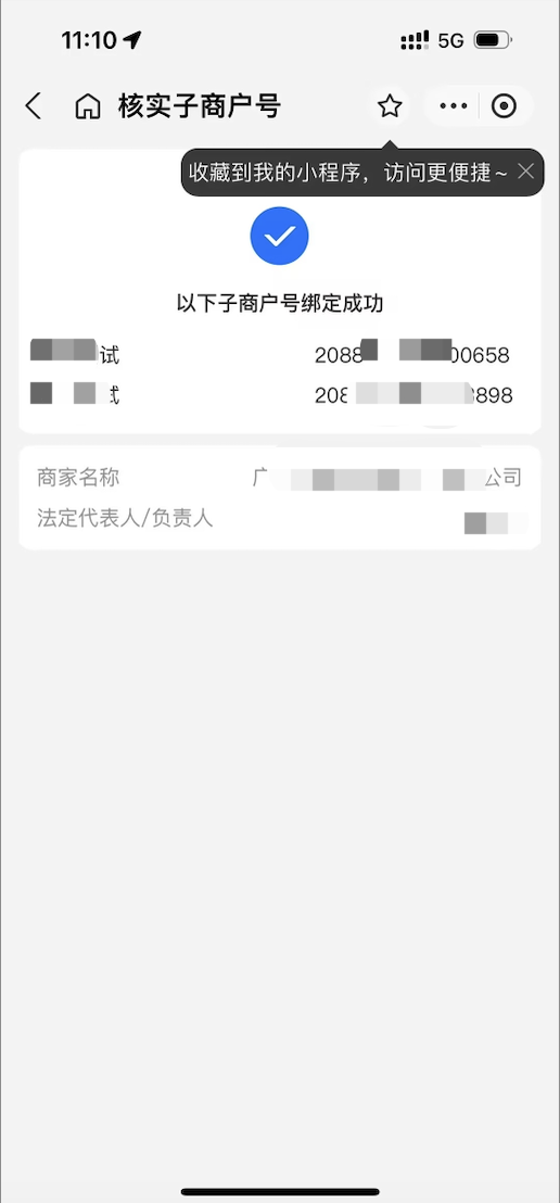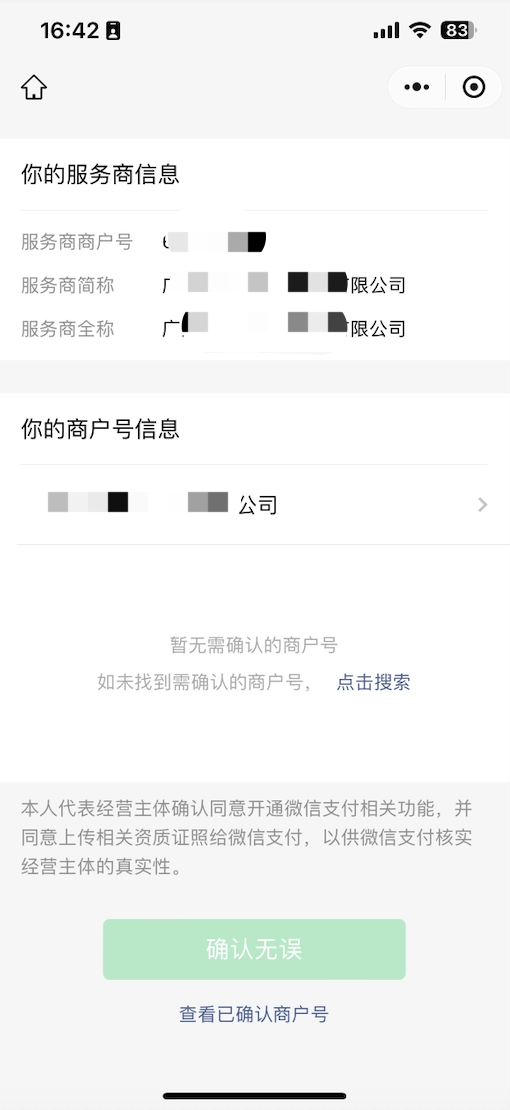 微信扫码认证界面如下,会显示渠道商服务商信息,和自己进件商户号信息,基本是公司主体,如果是个体户,则显示个体户名称。