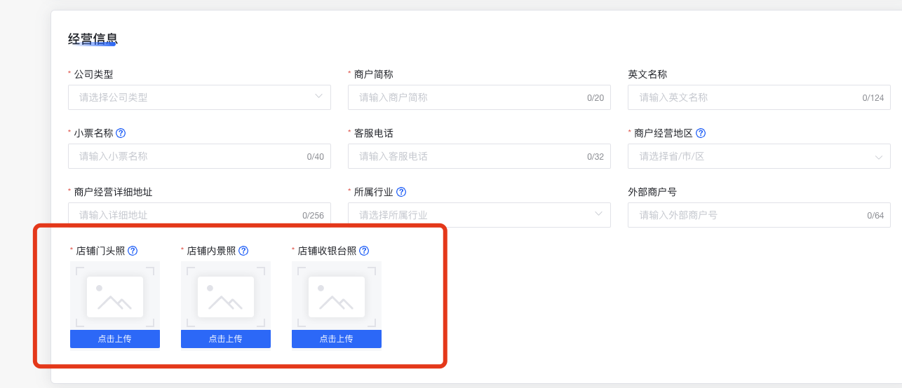 经营场景选择【线下场所】,需提供《店铺门头照》、《店铺内景照》、《店铺收银台照》
