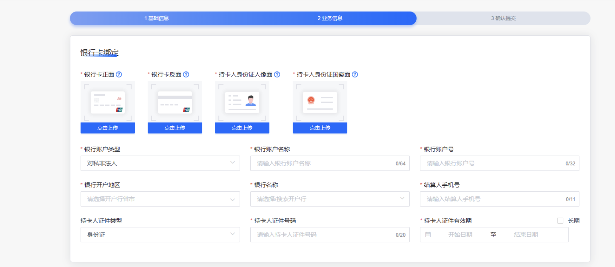 (3)选择对私非法人:银行账户名称、银行账户号、银行开户地区、银行名称、结算人手机号、持卡人证件类型(身份证)、持卡人证件号码、持卡人证件有效期