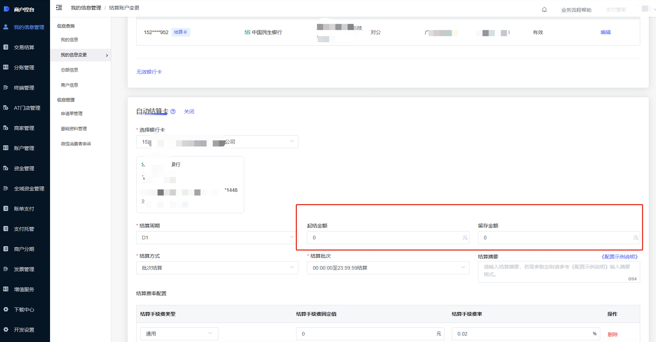 答:商户控台–我的信息变更–自动结算卡有可以设置起结金额、留存金额等。