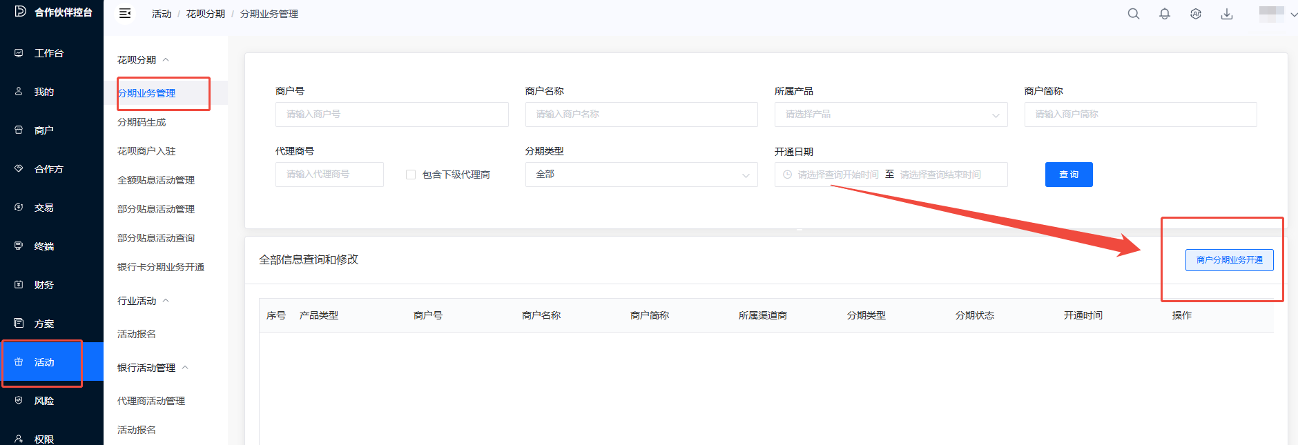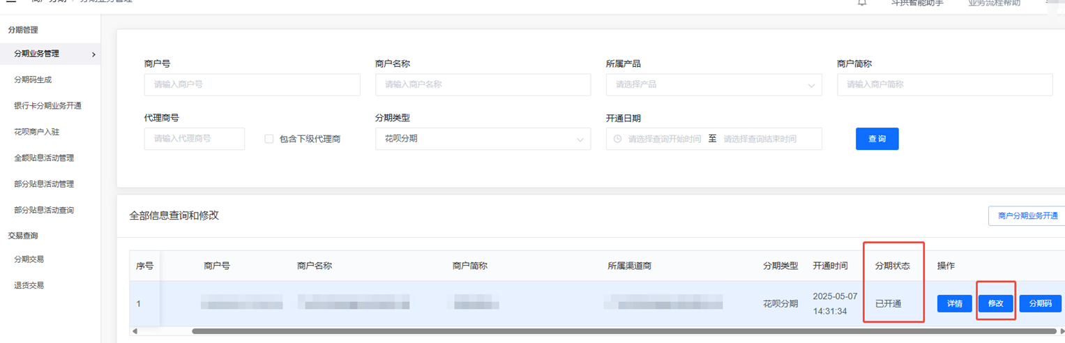 3、返回活动-分期业务管理-查询,分期状态若为已开通未激活,点击修改,产品状态修改为已开通