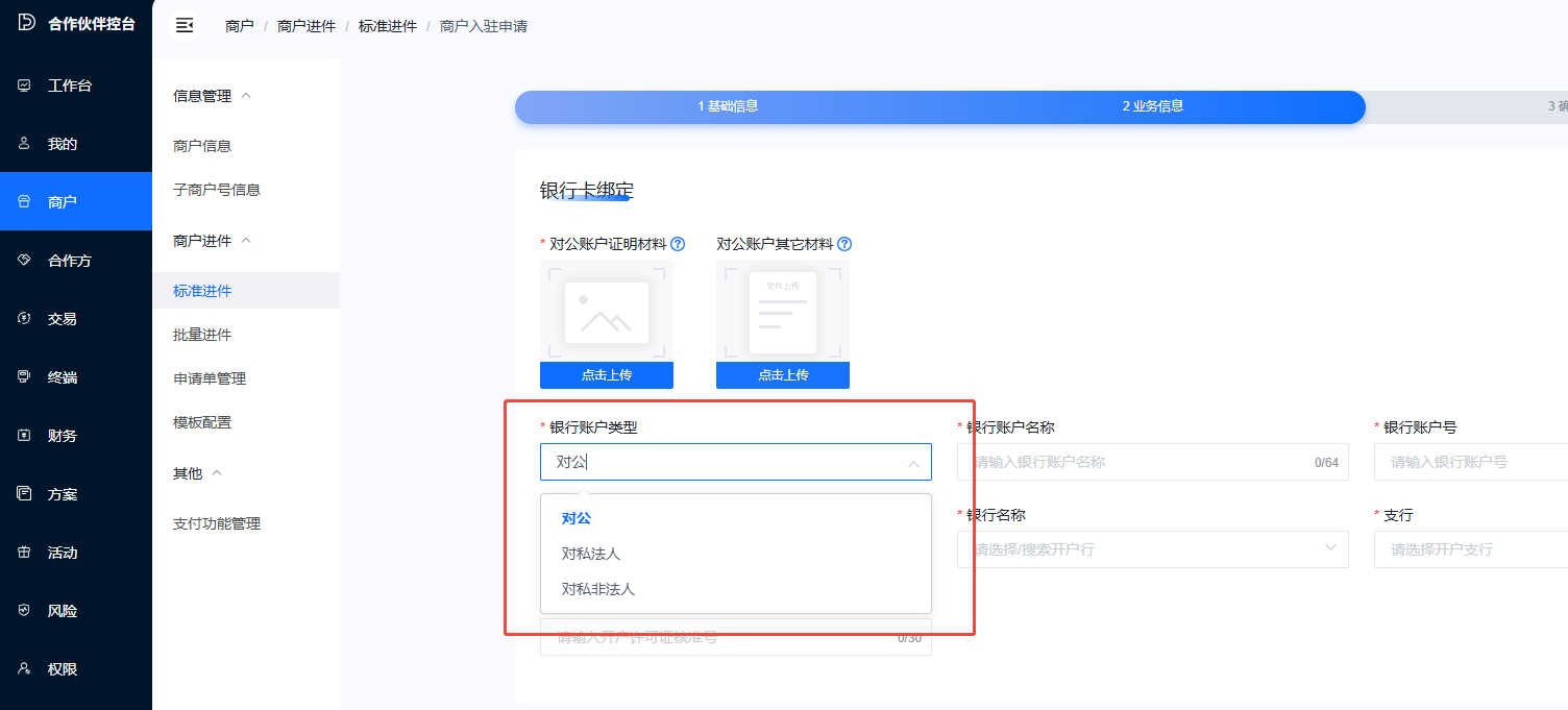 银行账户类型:支持对公、对私法人、对私非法人,根据选择的银行账户类型,填写银行卡相关信息