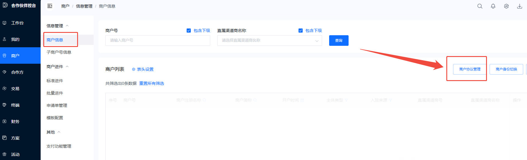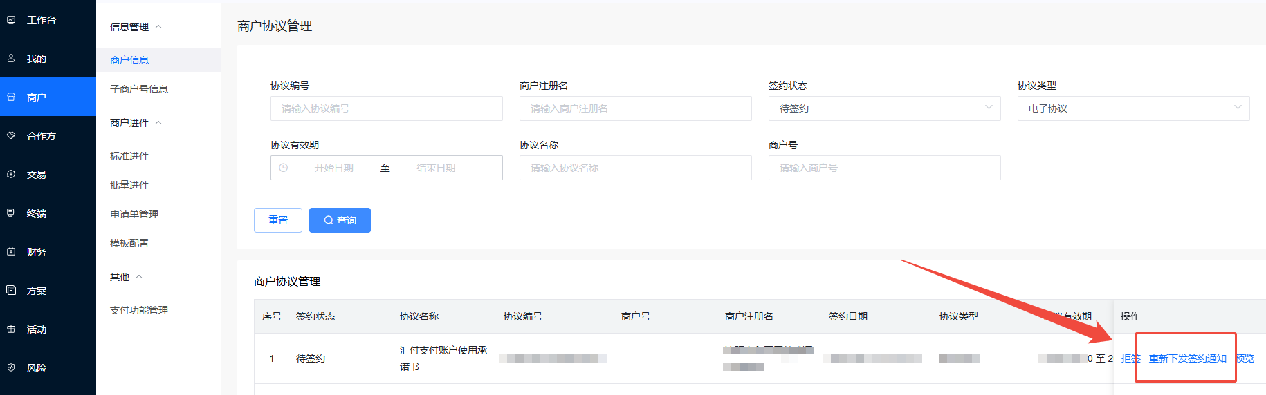 路径:汇付服务商后台 — 商户-商户信息 — 协议管理 ,点击进入,可以重新下发签约通知。
