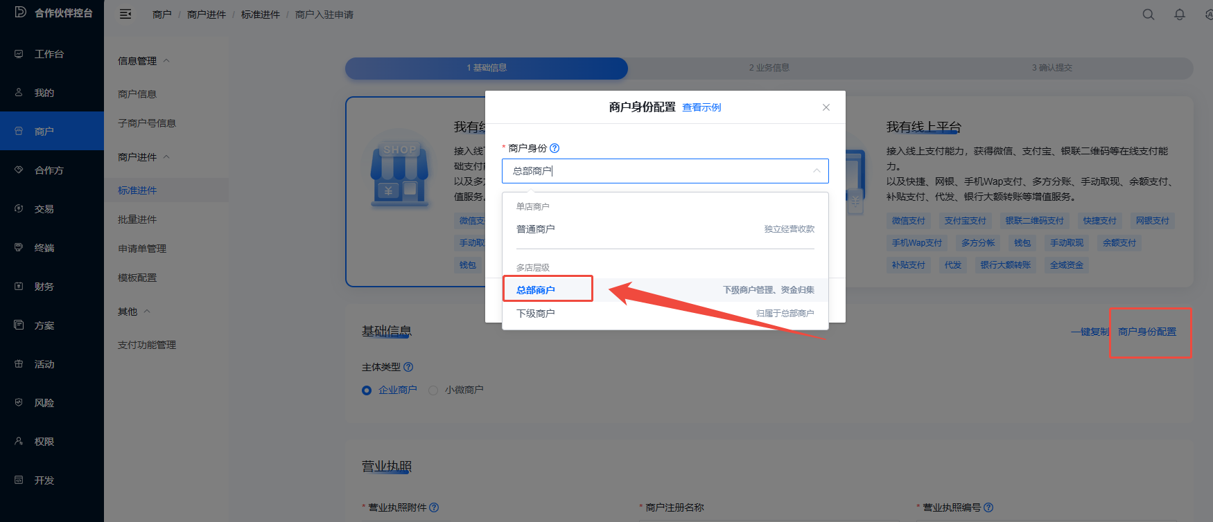 若要进行O2O门店分账,进件要手动切换为“总部商户”
