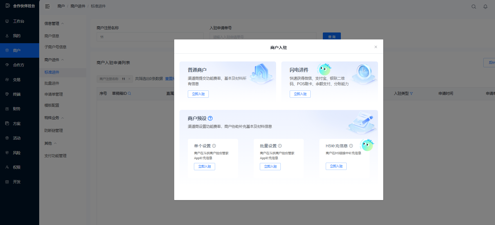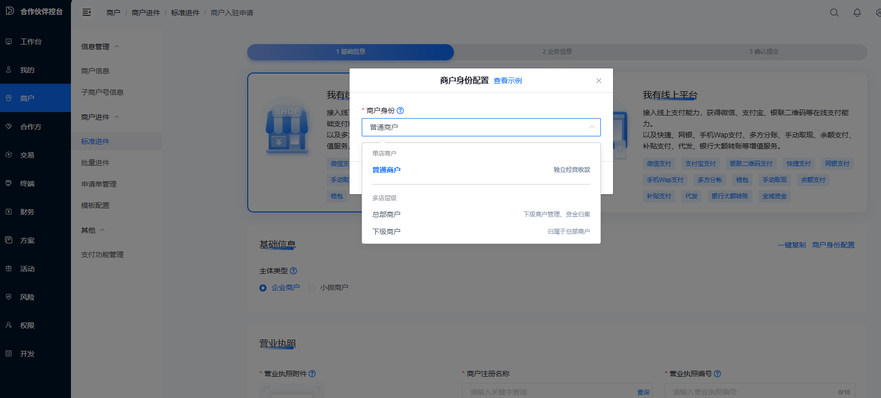 1、商户进件类型有“普通商户”、“闪电进件”“商户预设”(以下教程相关截图都是按普通商户,闪电进件的操作都一样,只是简略了)