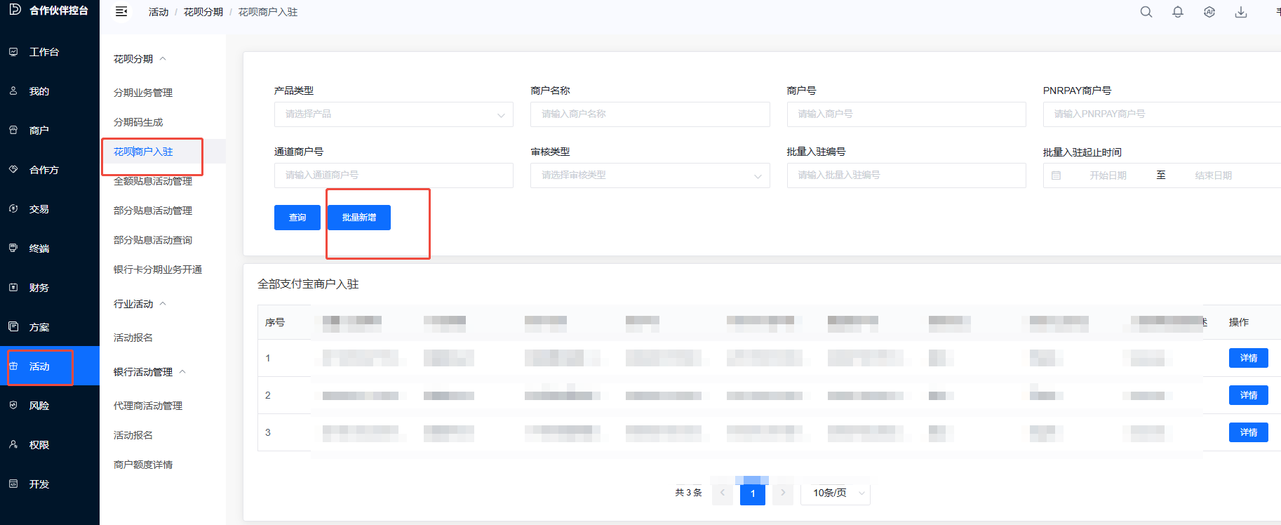 1、登录汇付服务商控台,活动-花呗商户入驻-批量新增,按要求下载模板,填写商户号,费率,上传表格