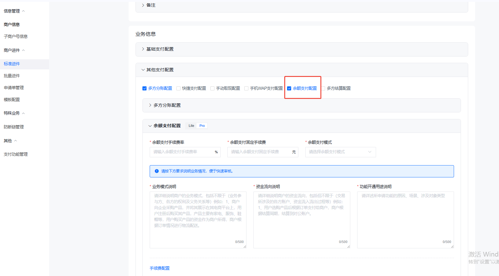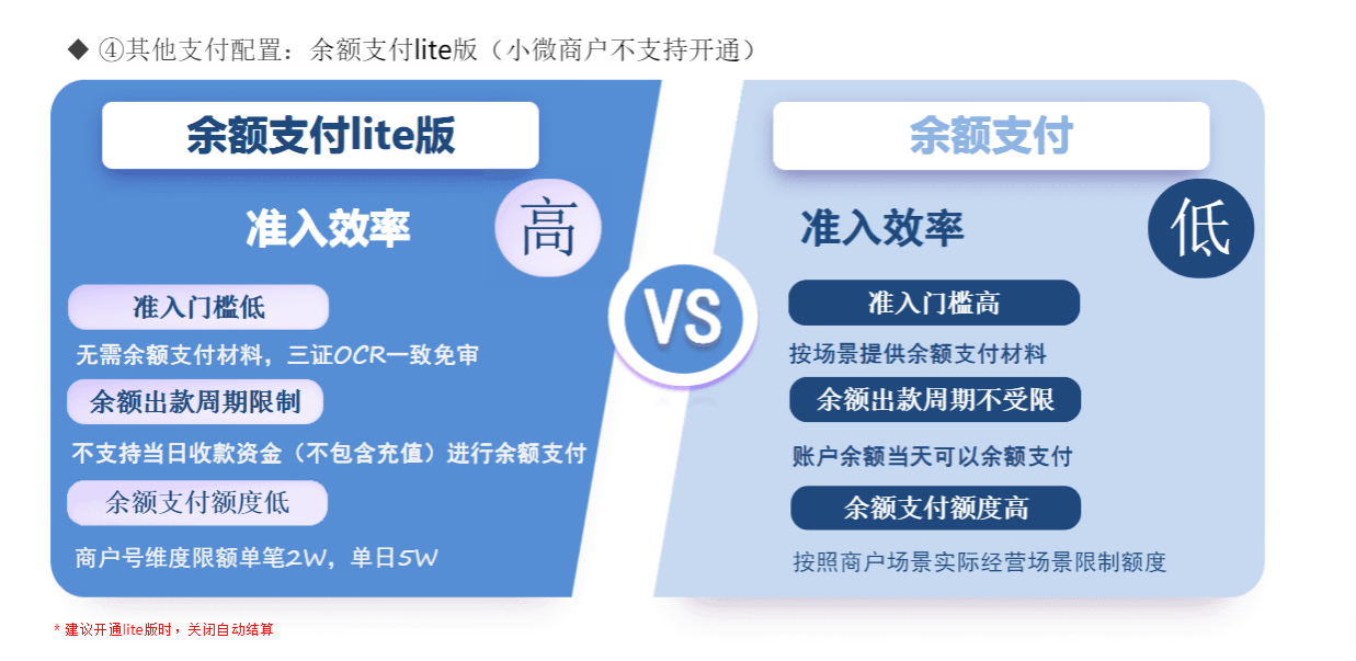 lite版:只支持企业商户开通,材料要求低,但不支持当日资金(包含收款和充值)进行余额支付,商户得关闭自动结算或设置留存金额;商户号维度限额单笔2W,单日5W,且不支持提额申请。