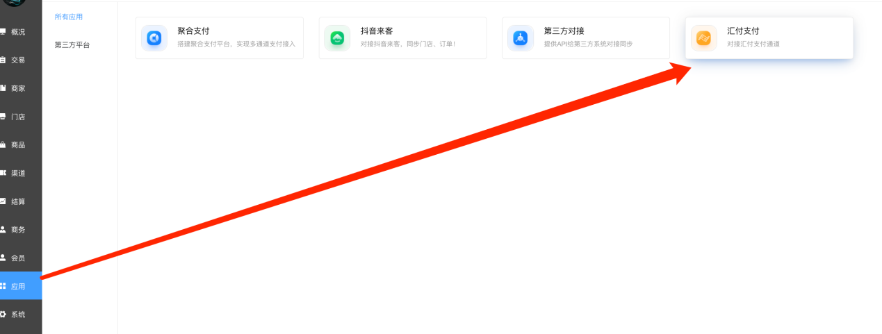 1、 从应用里进入“汇付支付”,开启插件。