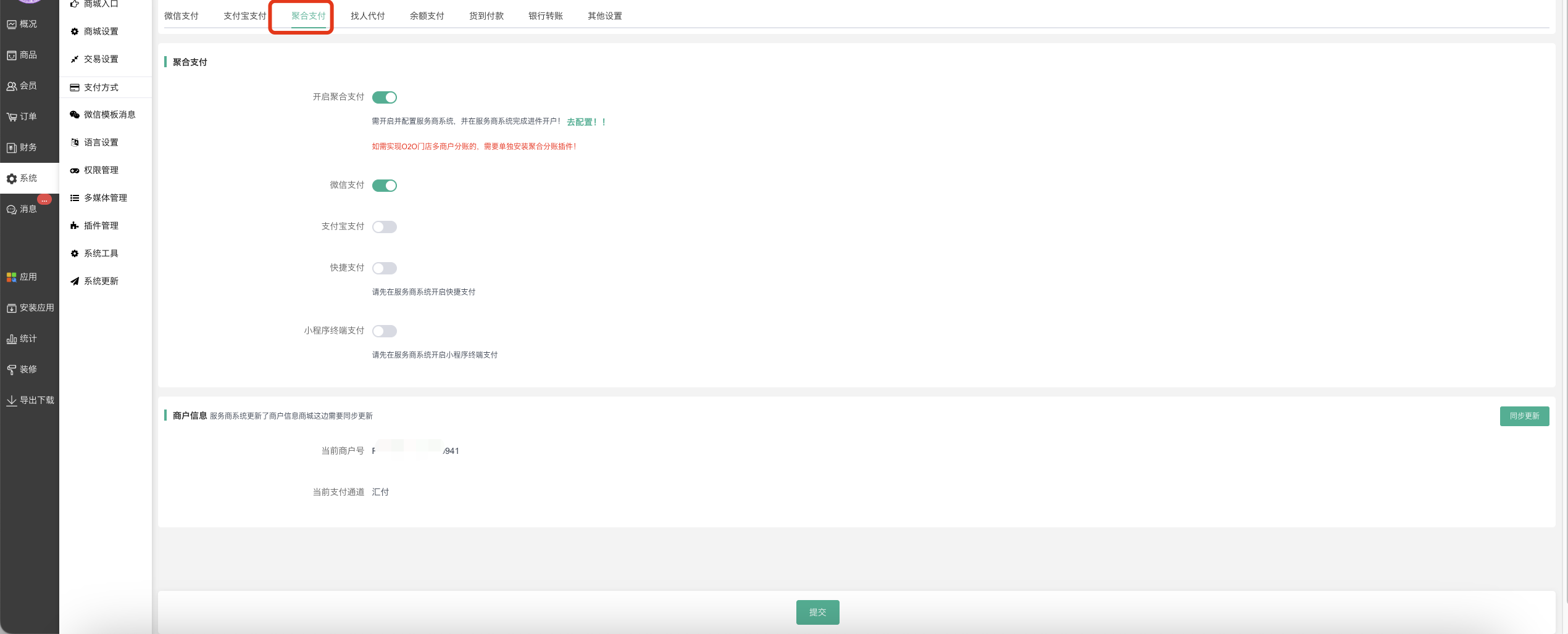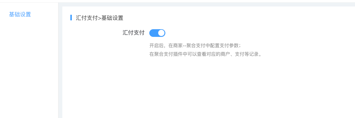 配置好汇付支付,再次进入聚合支付–基础设置–开启聚合支付,通道选择汇付支付,点击保存。