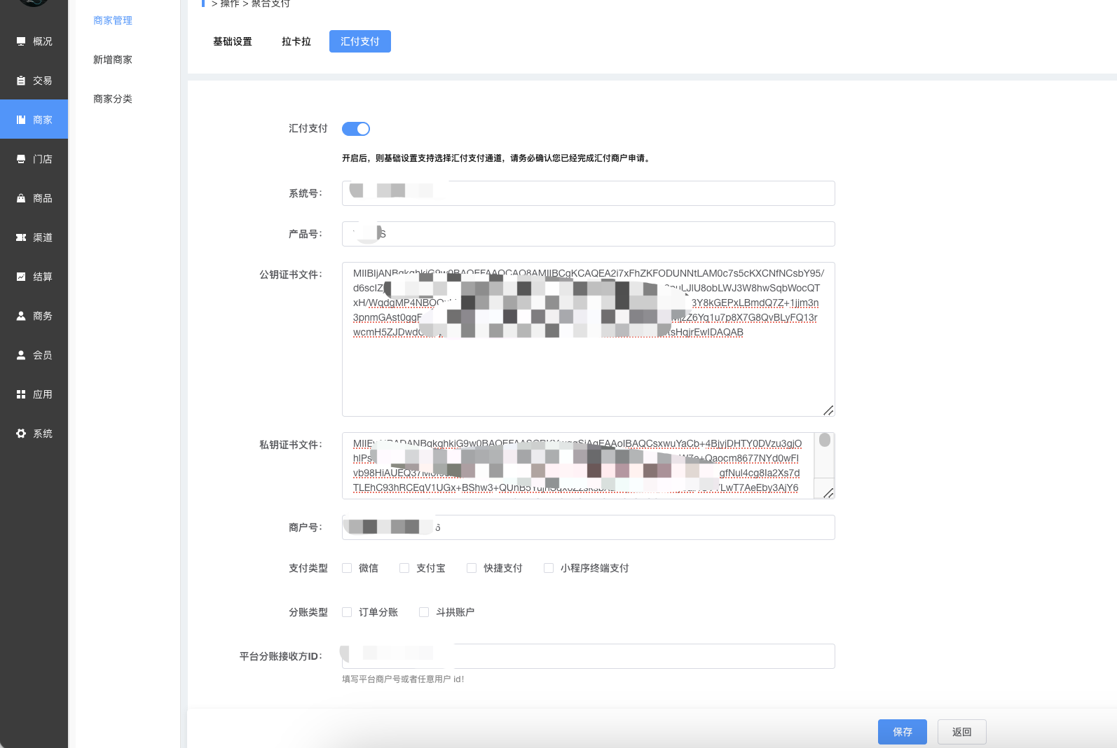 获取到的汇付公钥和服务商私钥填写到数据通后台 — 商家管理 — 聚合支付 — 汇付支付里。