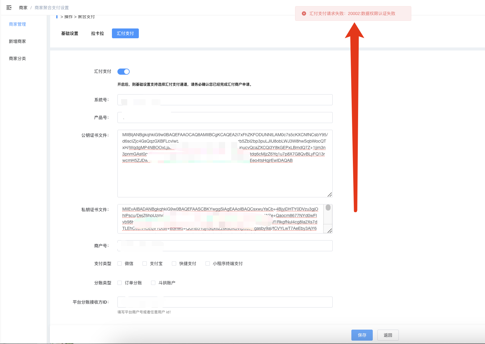问题:如果在配置汇付支付时提示汇付支付请求失败:20002:数据权限认证失败,这个一般是汇付进件商户号没认证微信支付、支付宝支付,处理方法:要登录汇付服务商后台https://dashboard.huifu.com/partners/login,在商户管理,商户信息那认证微信支付、支付宝支付。