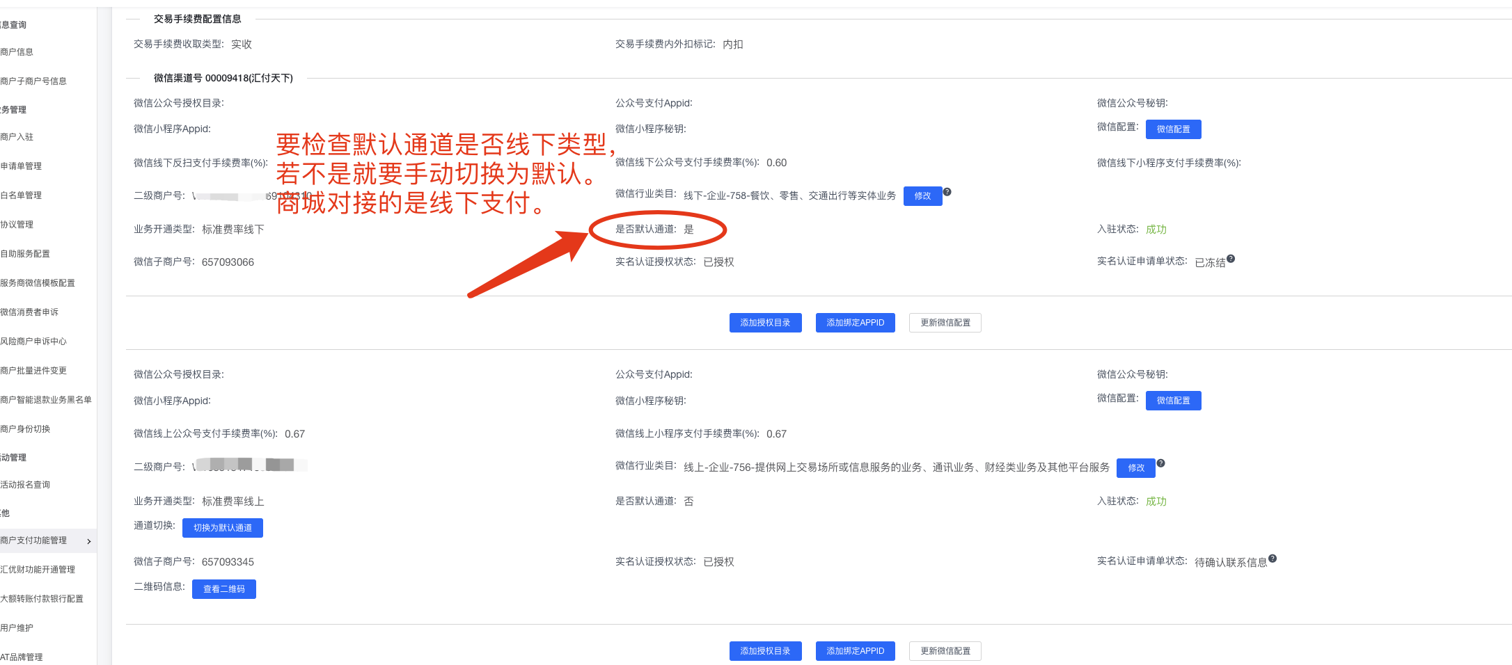 注意:商城为总部商户号,总部商户为主商户,不能添加为子商户,否则出现未知异常,支付状态无法返回,原因是主子商户数据重复。