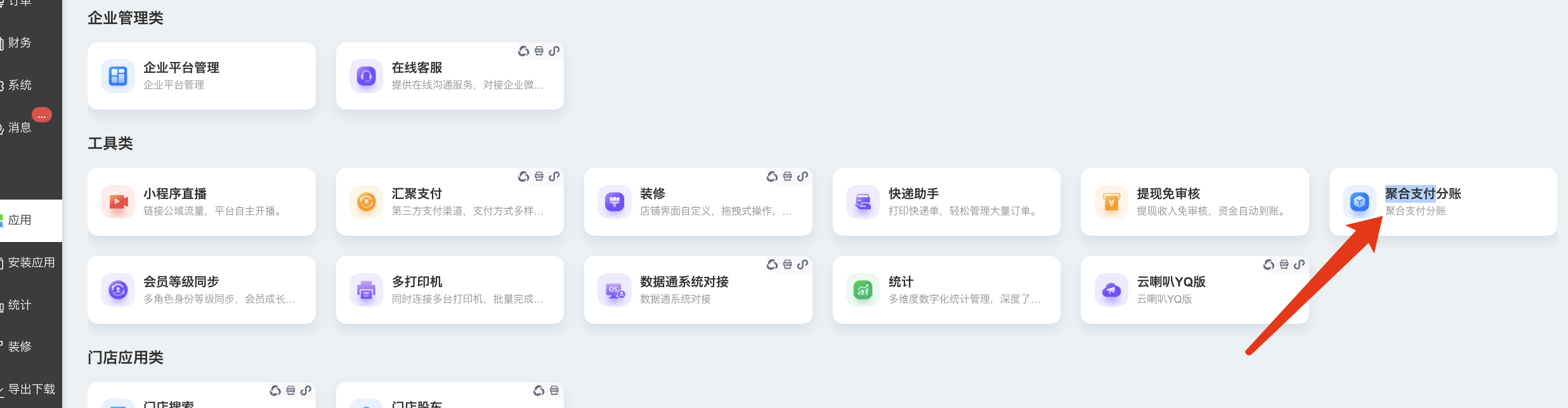 路径:商城后台 — 应用 — 聚合支付分账