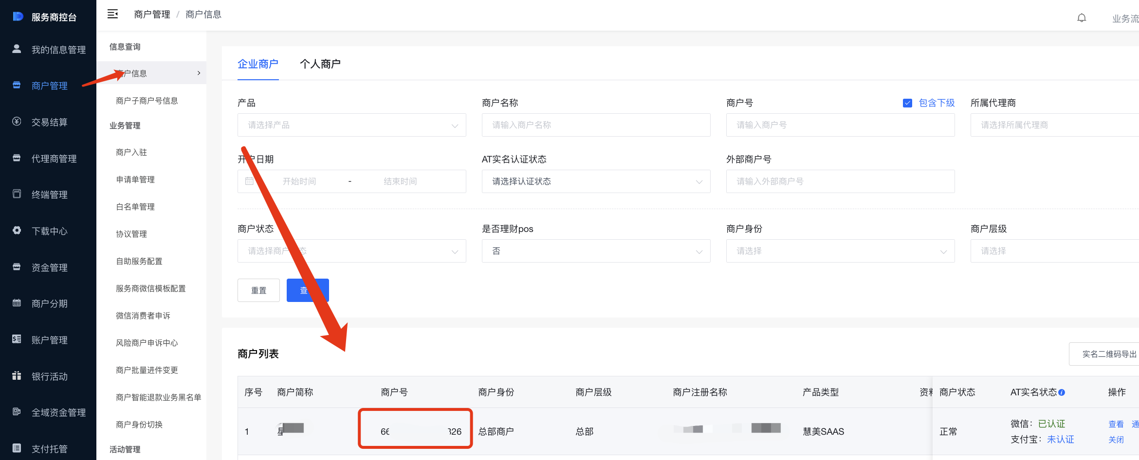 (1)可以查看商户编号,支付商户号,所属通道(汇付),商户号ID(即汇付商户号)