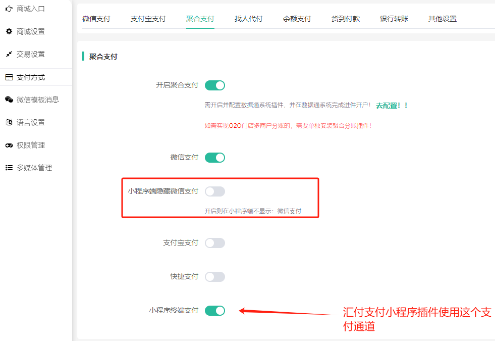 在商城系统–系统–支付方式–聚合支付需要勾选小程序终端支付使用,可以开启小程序端隐藏微信支付(避免用户点击错支付方式)