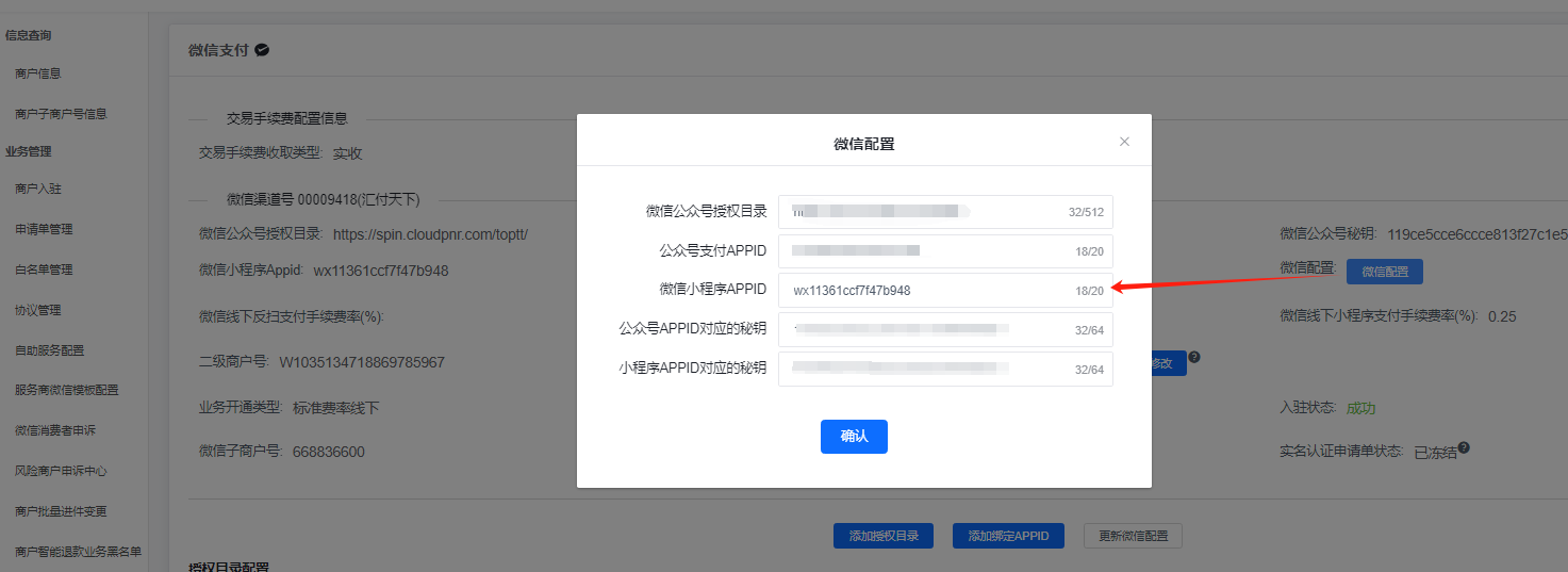 商户管理 — 商户支付功能管理 — 配置 — 点击微信配置,填写跟商户同一主体的公众号、小程序 appid appsecret,微信公众号授权目录填写 https://spin.cloudpnr.com/ 、和支付授权目录。如果已配置过,可忽略。