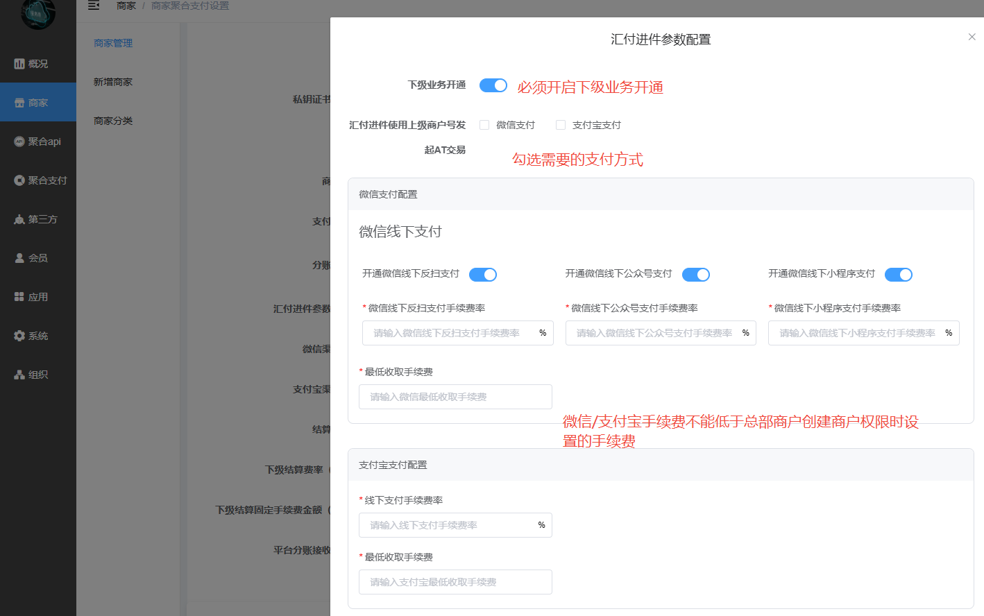 下级结算费率(%)、下级结算固定手续费金额(元)(不能低于商户结算费率和固定金额,在汇付服务商后台-商户管理-对应商户点击查看-业务信息-结算信息,汇付没开通余额支付可不填)