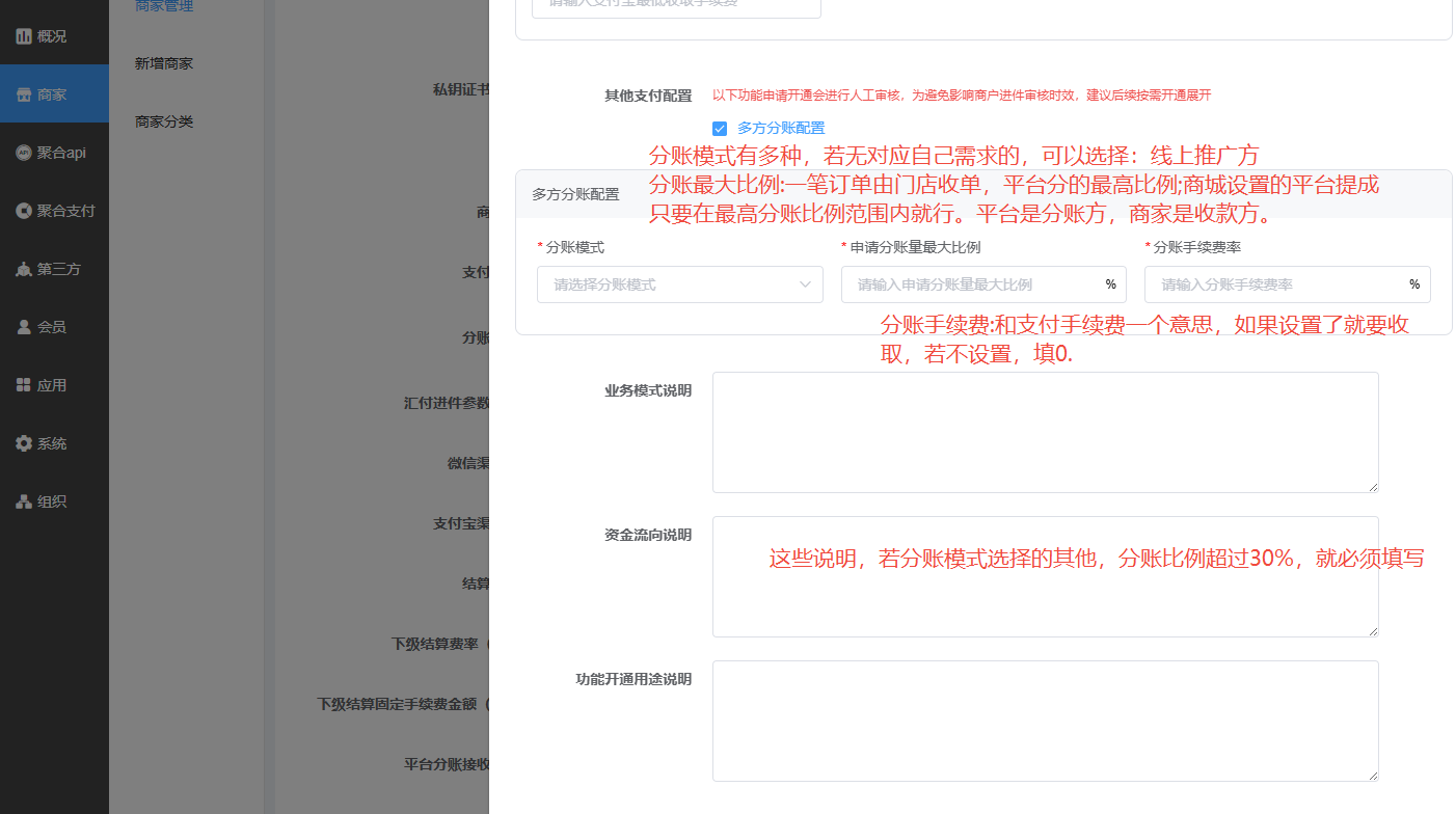 (二)门店支付方式开启聚合支付,开启分账,设置好平台提成比例。