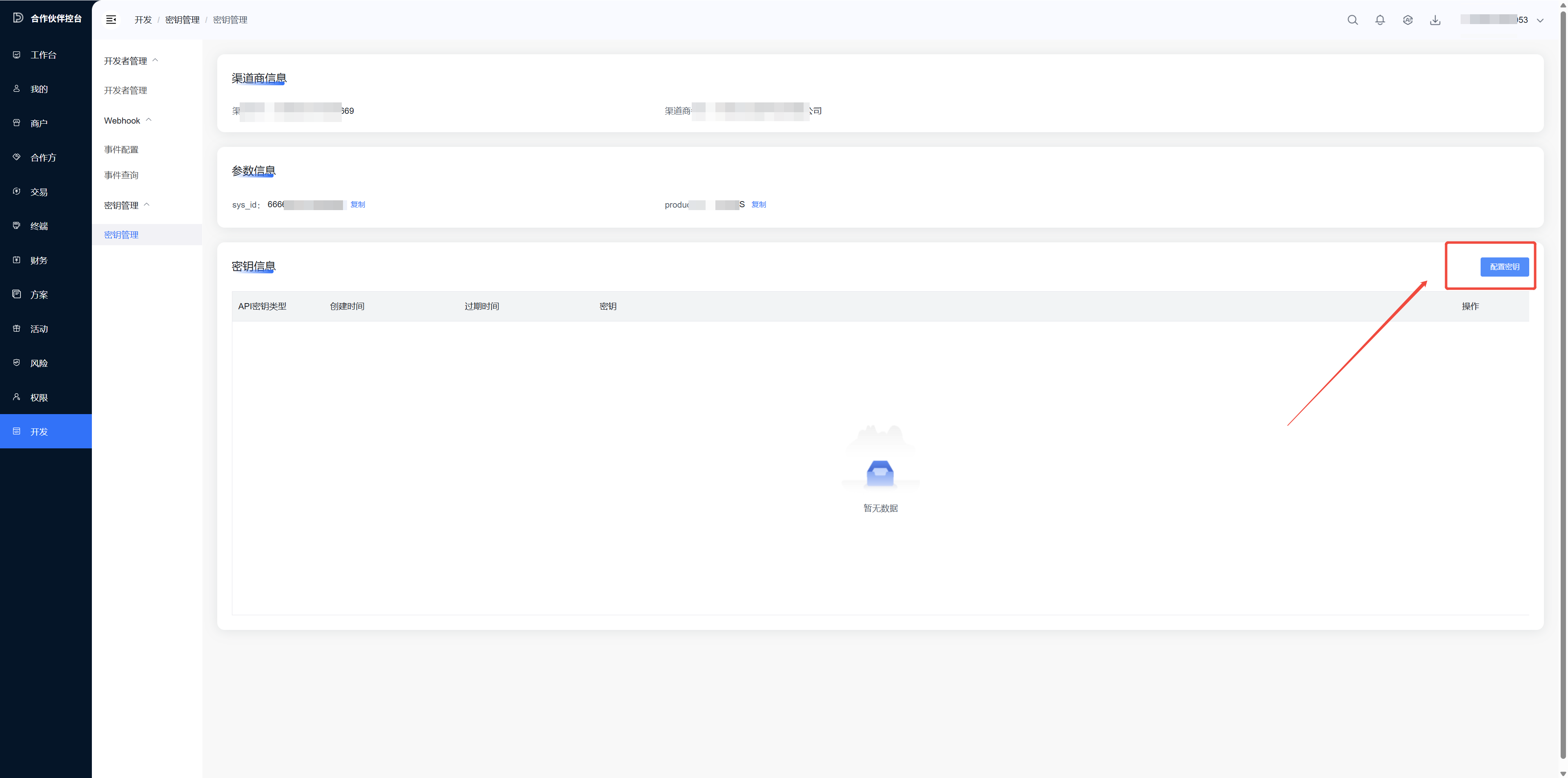 在汇付服务商后台进入开发设置里,生成自己的密钥。(注意:私钥仅支持首次生成时下载,请务必下载保存好!!)